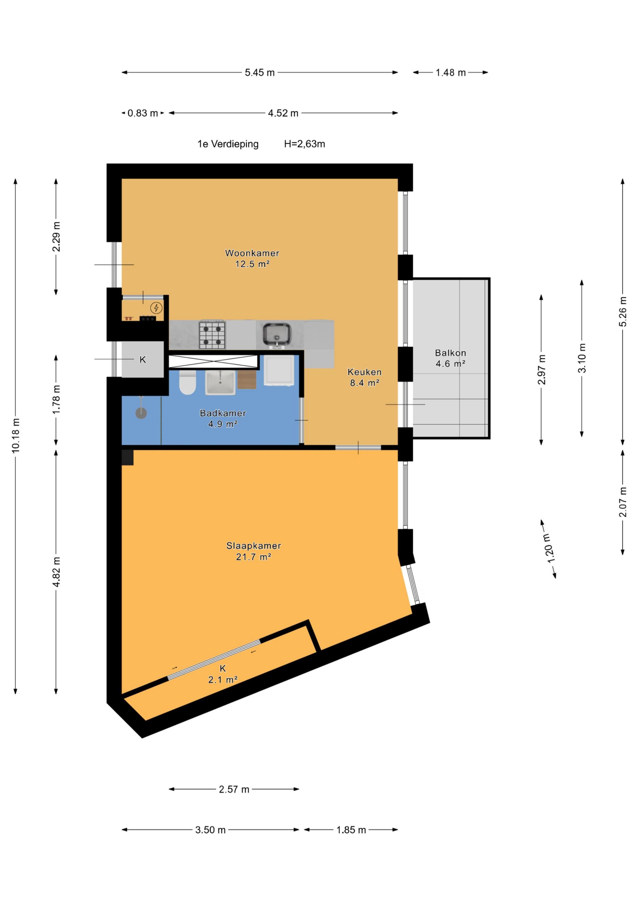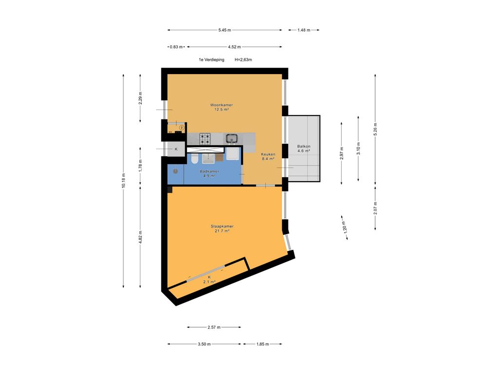 Ruime L-vormige wooneetkamer (ca. 5.45 x 5.26m) voorzien van een houten vloer, toegang tot het balkon en veel lichtinval.