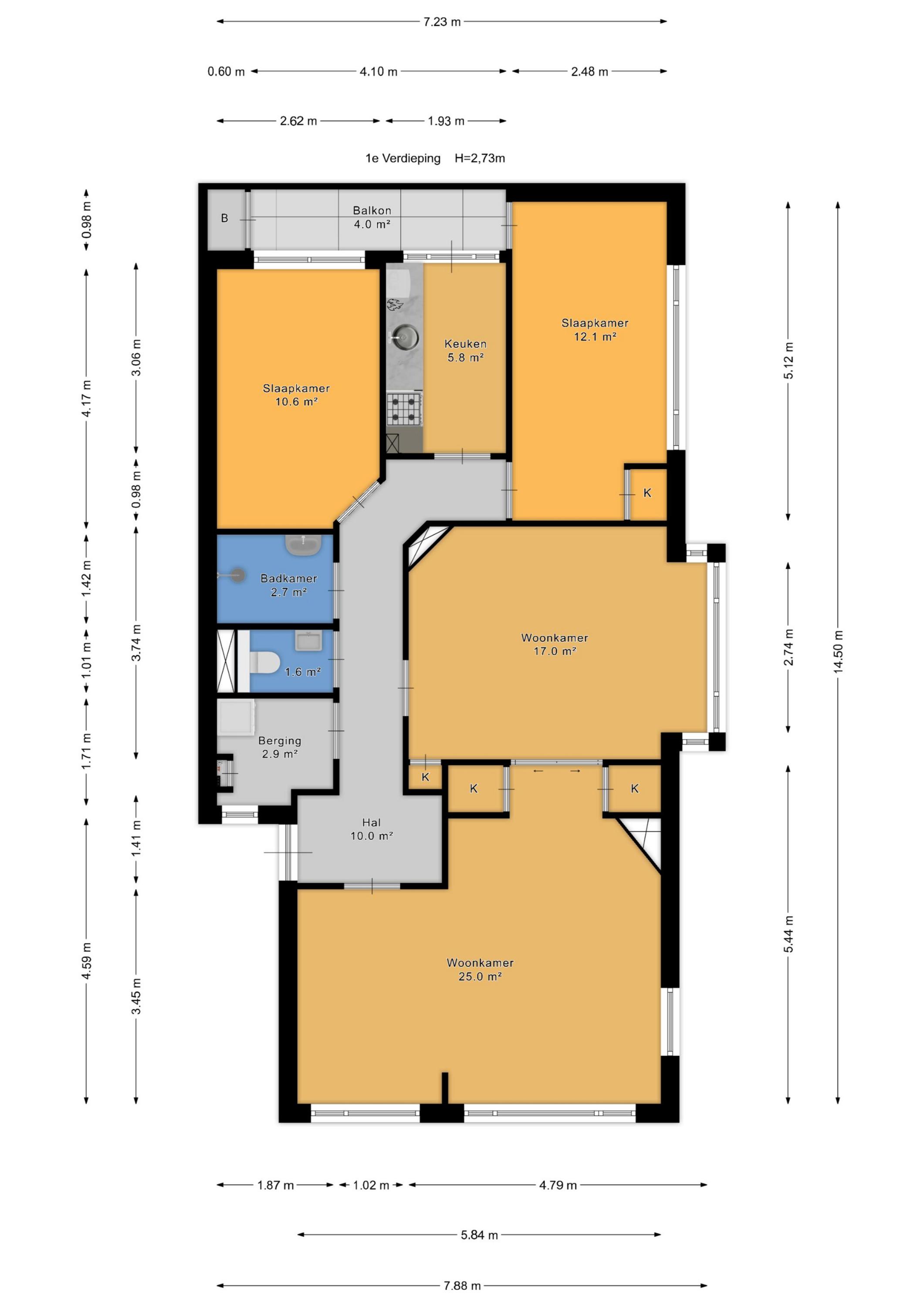 Zonnig balkon (ca. 4.10 x 0.98) met balkonkast, zeer gunstig gelegen op de middag- en avondzon.