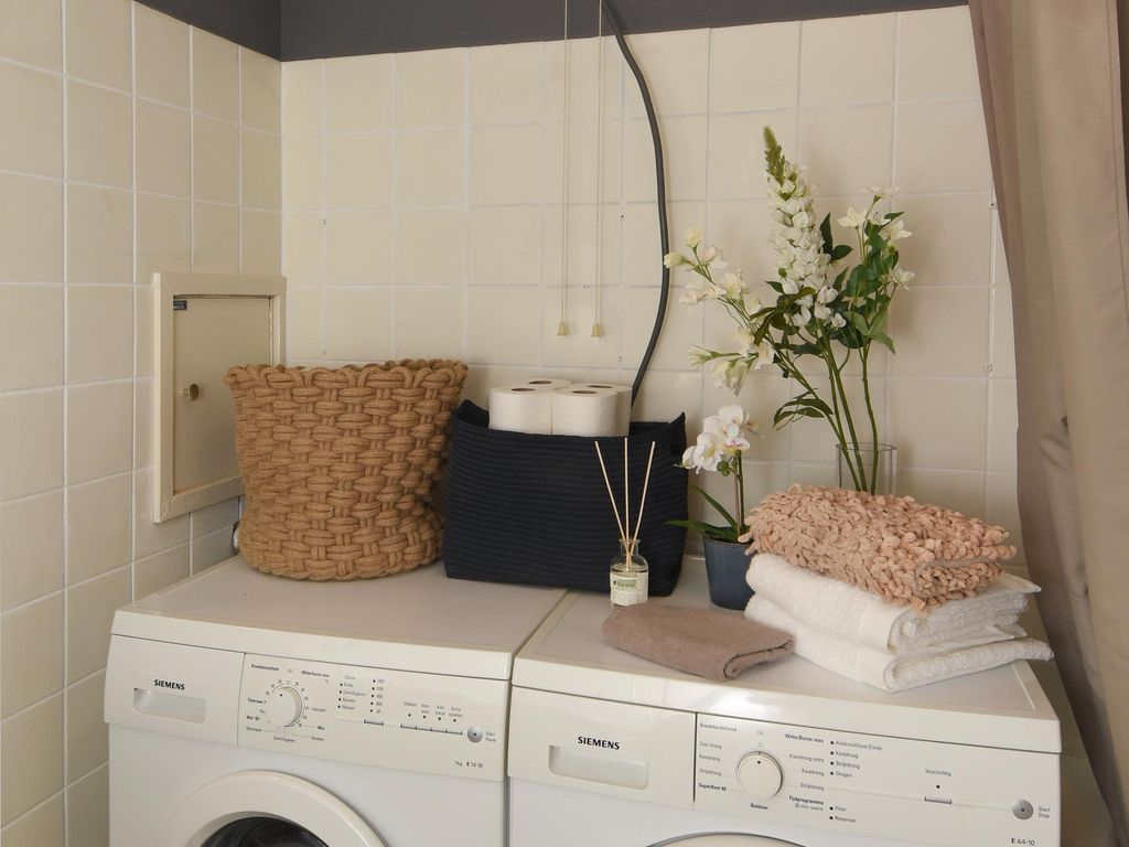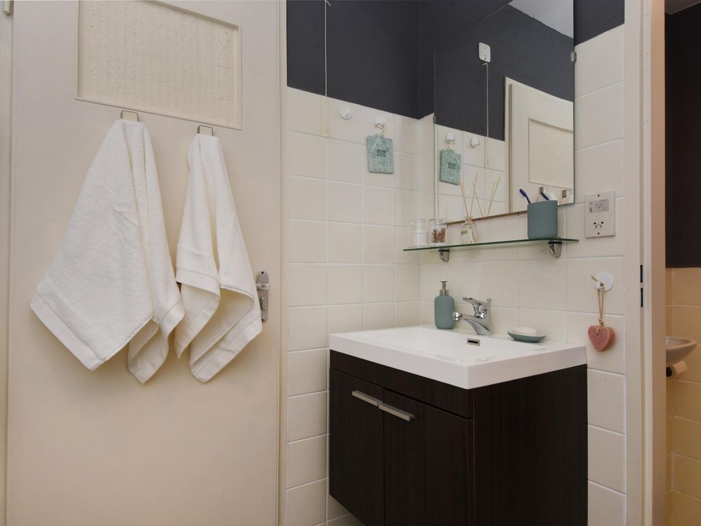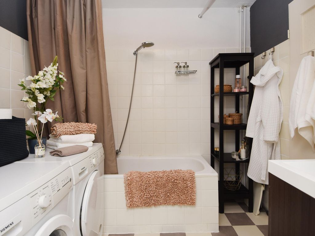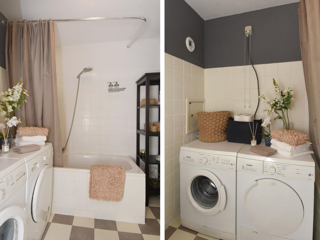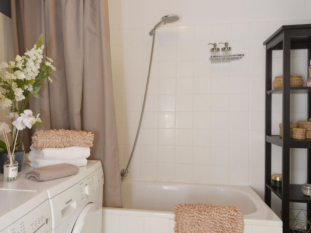 Nette badkamer (ca. 2.33 x 2.11m) met ligbad, douche, wastafel en wasmachine-aansluiting.