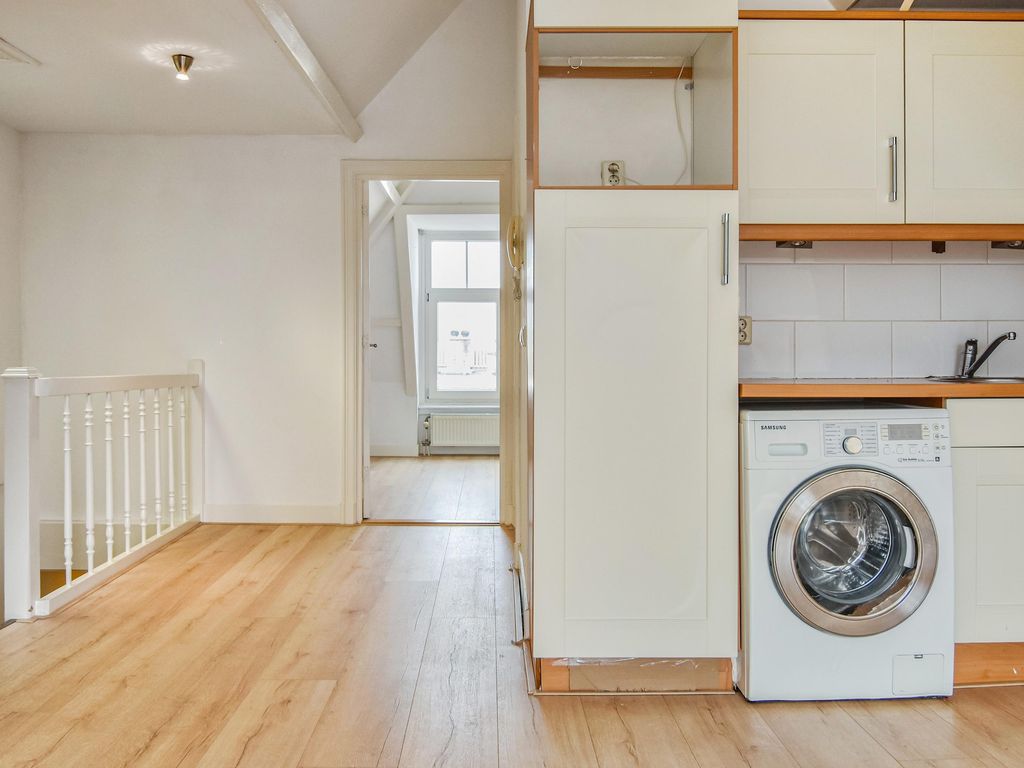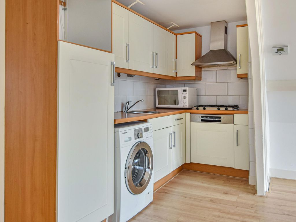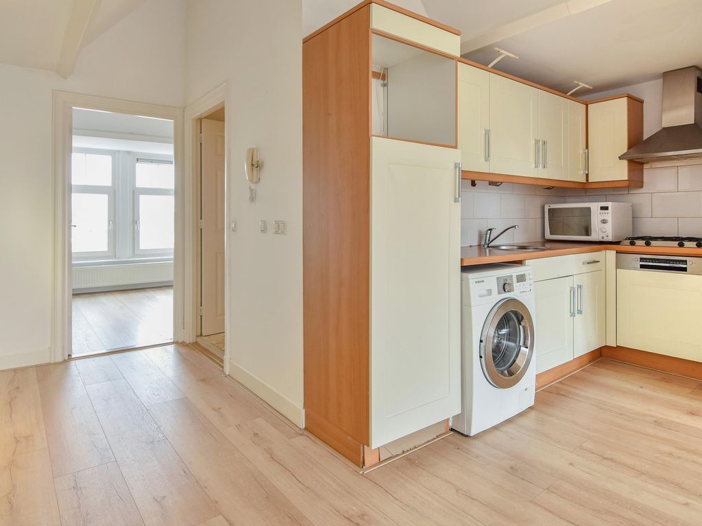 Nette open keuken (ca. 2.79 x 1.54m) met keukenblok in hoekopstelling met onder- en boven kasten, 4-pits gaskookplaat, afzuigkap magnetron, koelkast, vriezer, vaatwasser en wasmachine.