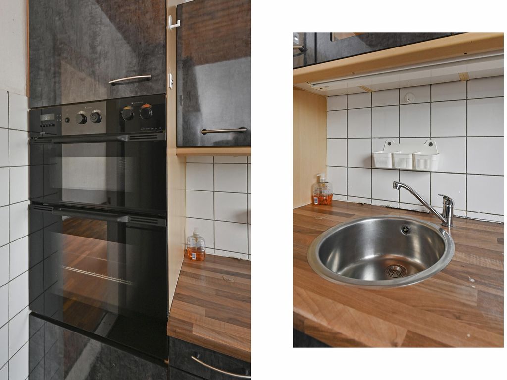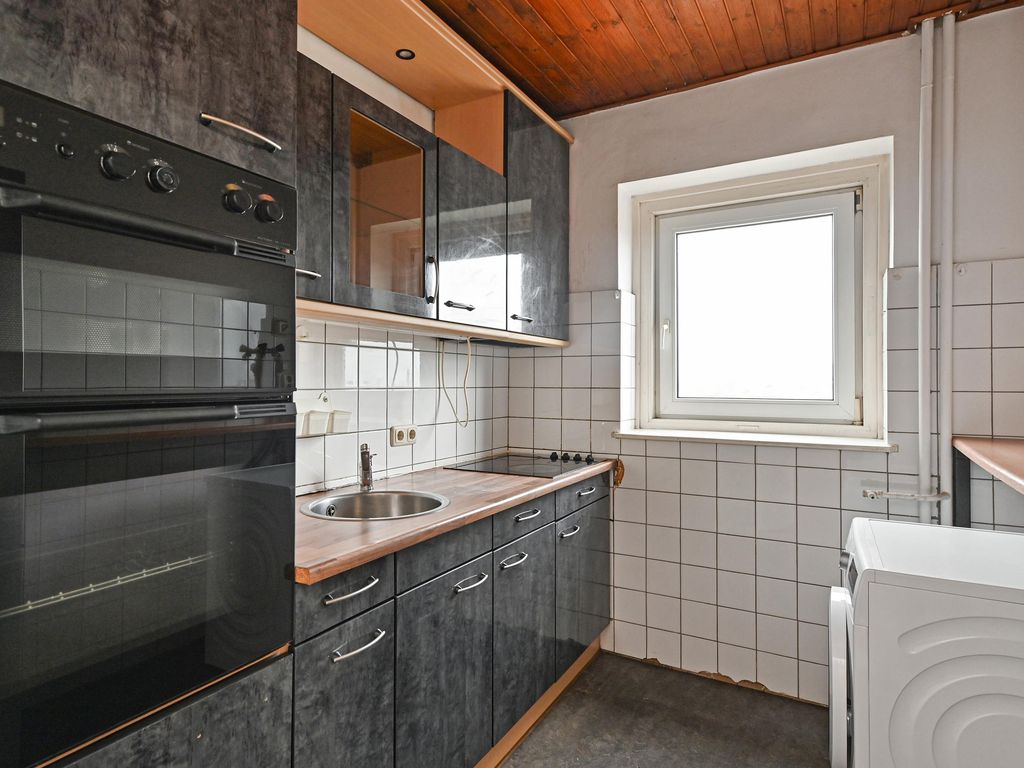 Eenvoudige keuken (ca. 2.47 x 2.39m) met 4-pits elektrische kooplaat, afzuigkap, oven, magnetron, koelkast, vriezer en wasmachine.