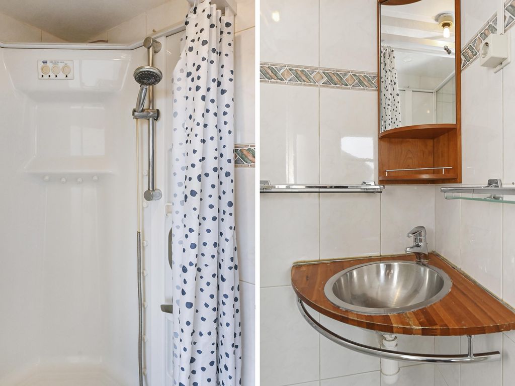 Eenvoudige badkamer (ca. 1.79 x 1.13m) met douche, en wastafel.