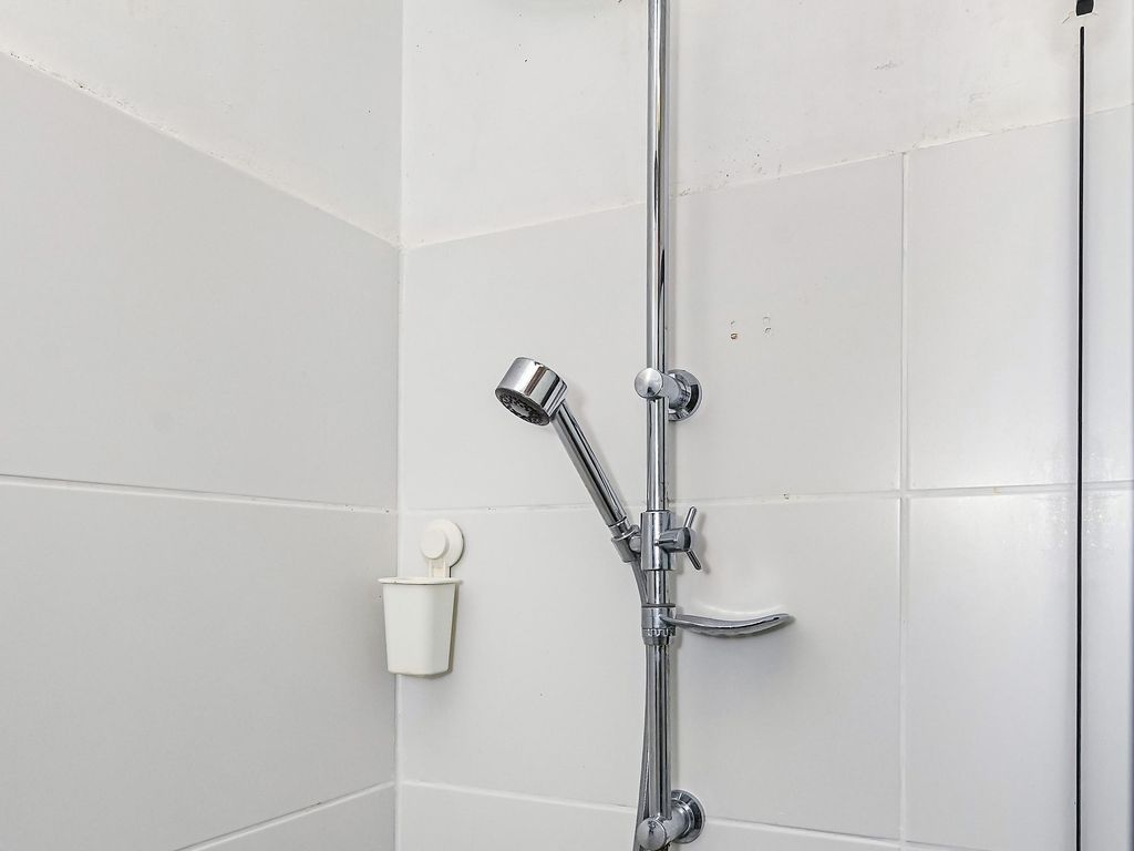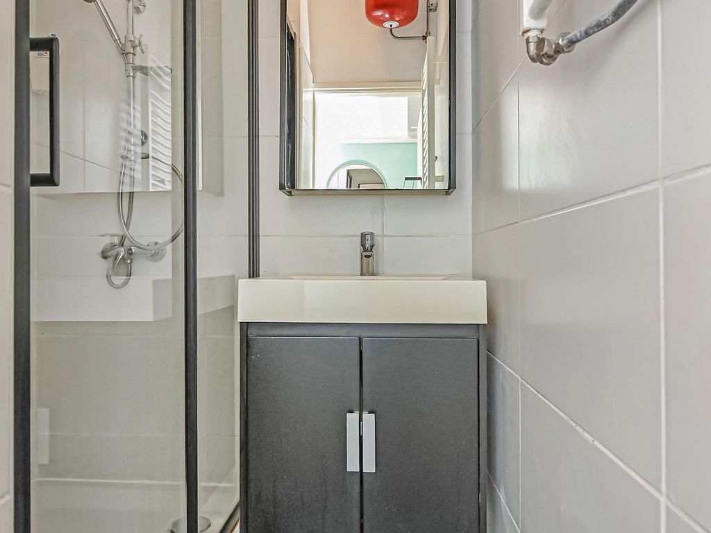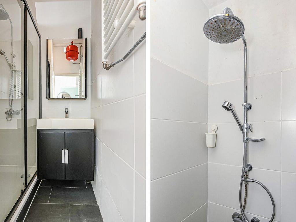 Moderne badkamer (ca. 1.72 x 1.57m) met douche, wastafelmeubel en designradiator.