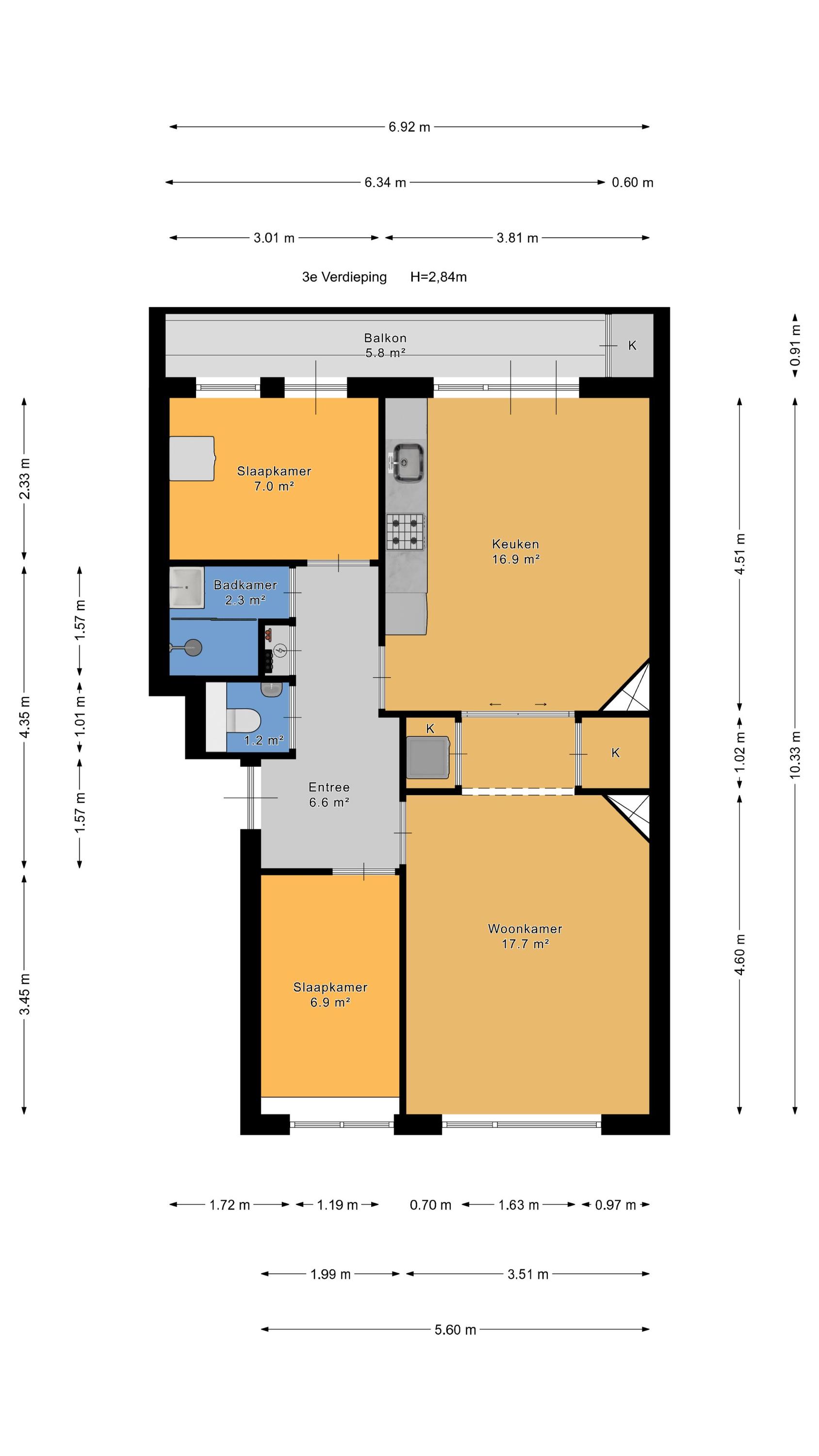 Balkon over de gehele breedte aan de achterzijde met balkonkast.