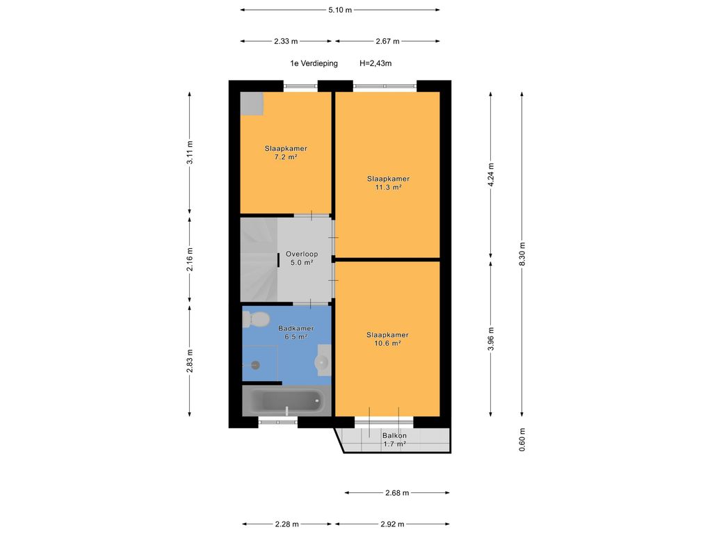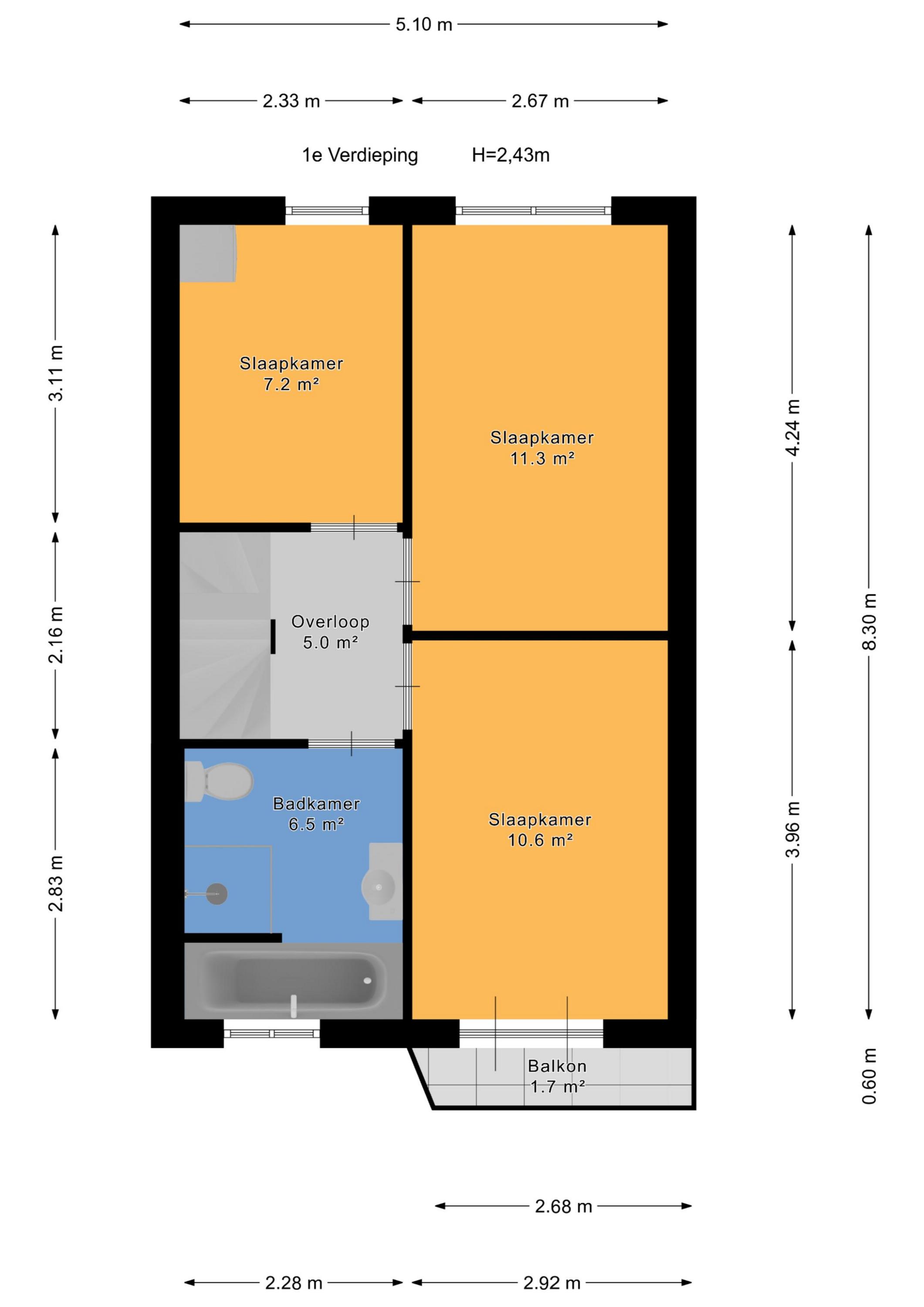 Klein balkon aan de voorzijde (ca. 2.68 x 0.60m).
