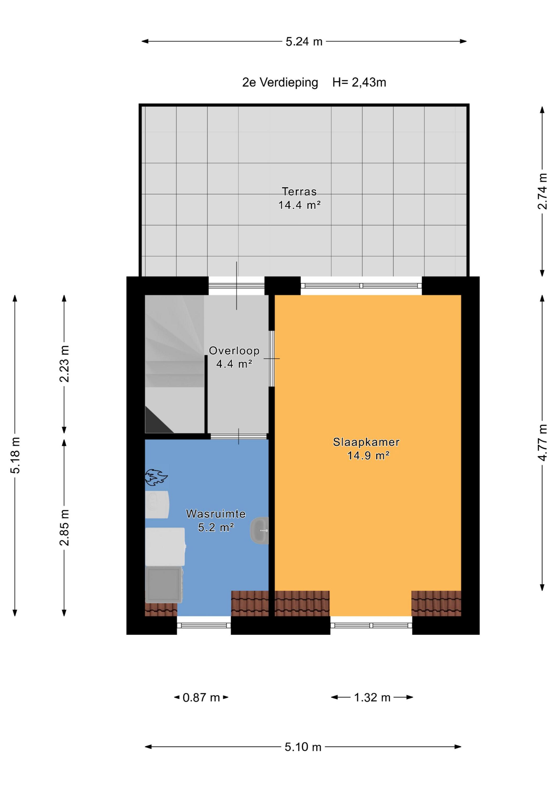 Groot dakterras over de gehele achterzijde van de woning (ca. 5.24 x 2.74m) op het Zuidoosten.