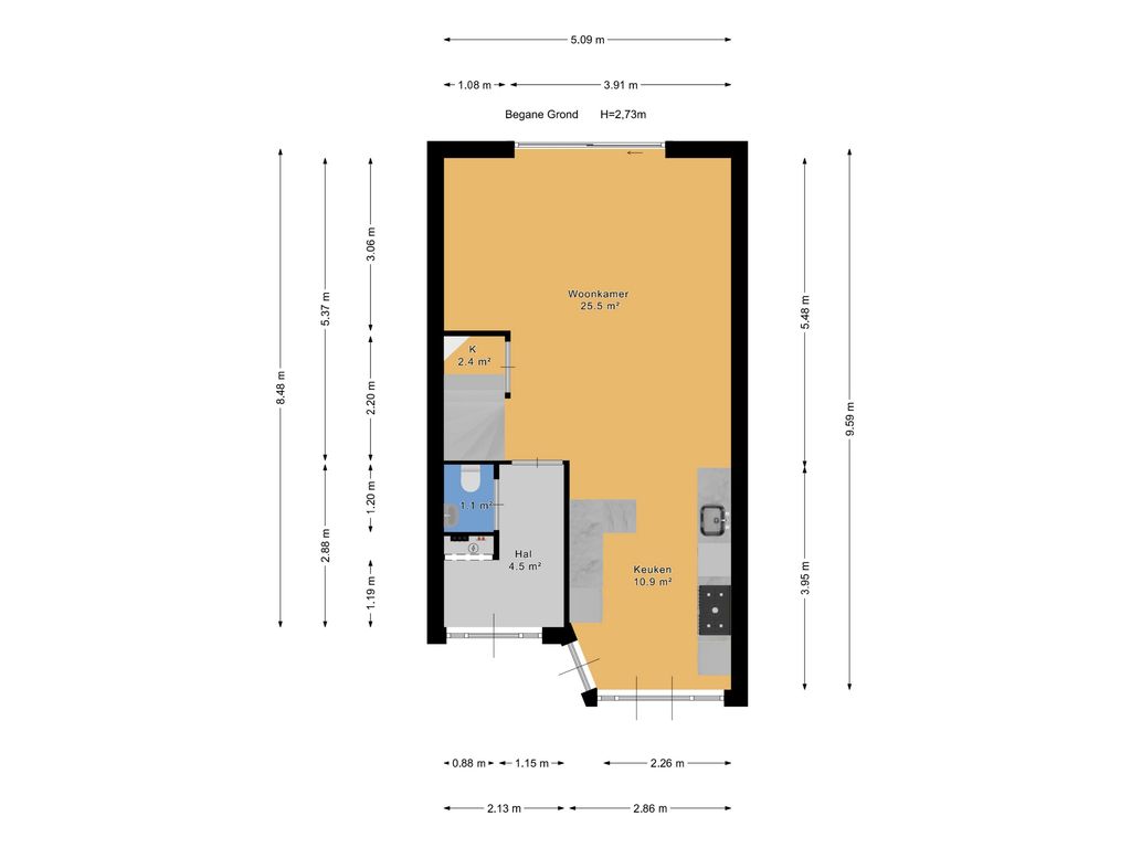 Toegang via voortuin (ca. 5.40 x 4.03/2.92m), entree, ruime hal met meterkast, toilet en toegang tot de ruime wooneetkamer.