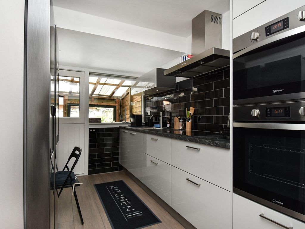 Moderne keuken (ca. 5.58 x 1.95m) met 4-pits inductiekookplaat, afzuigkap, oven, koelkast en vaatwasser.
