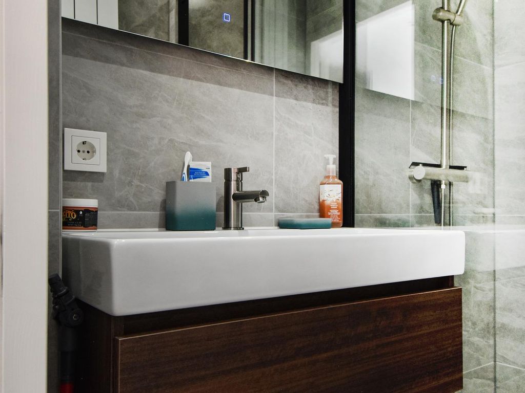 Fraaie luxe badkamer met douche en wastafelmeubel.