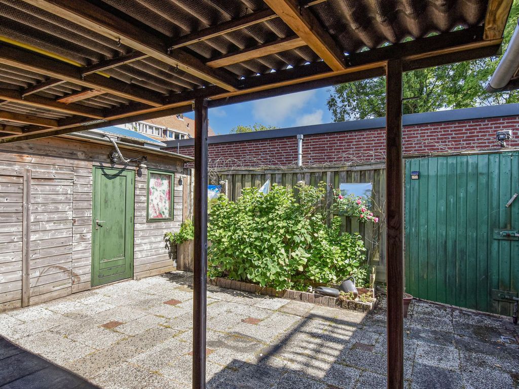 Nette achtertuin (ca. 6.01 x 5.49m) met achterom, overkapping en grote houten schuur met elektra.