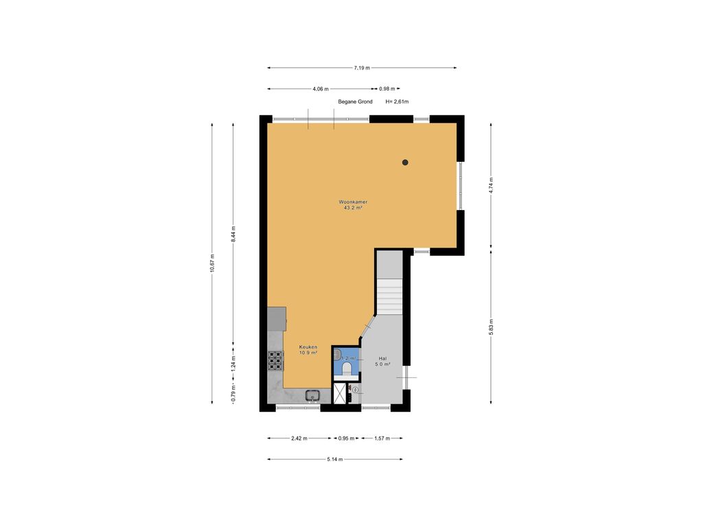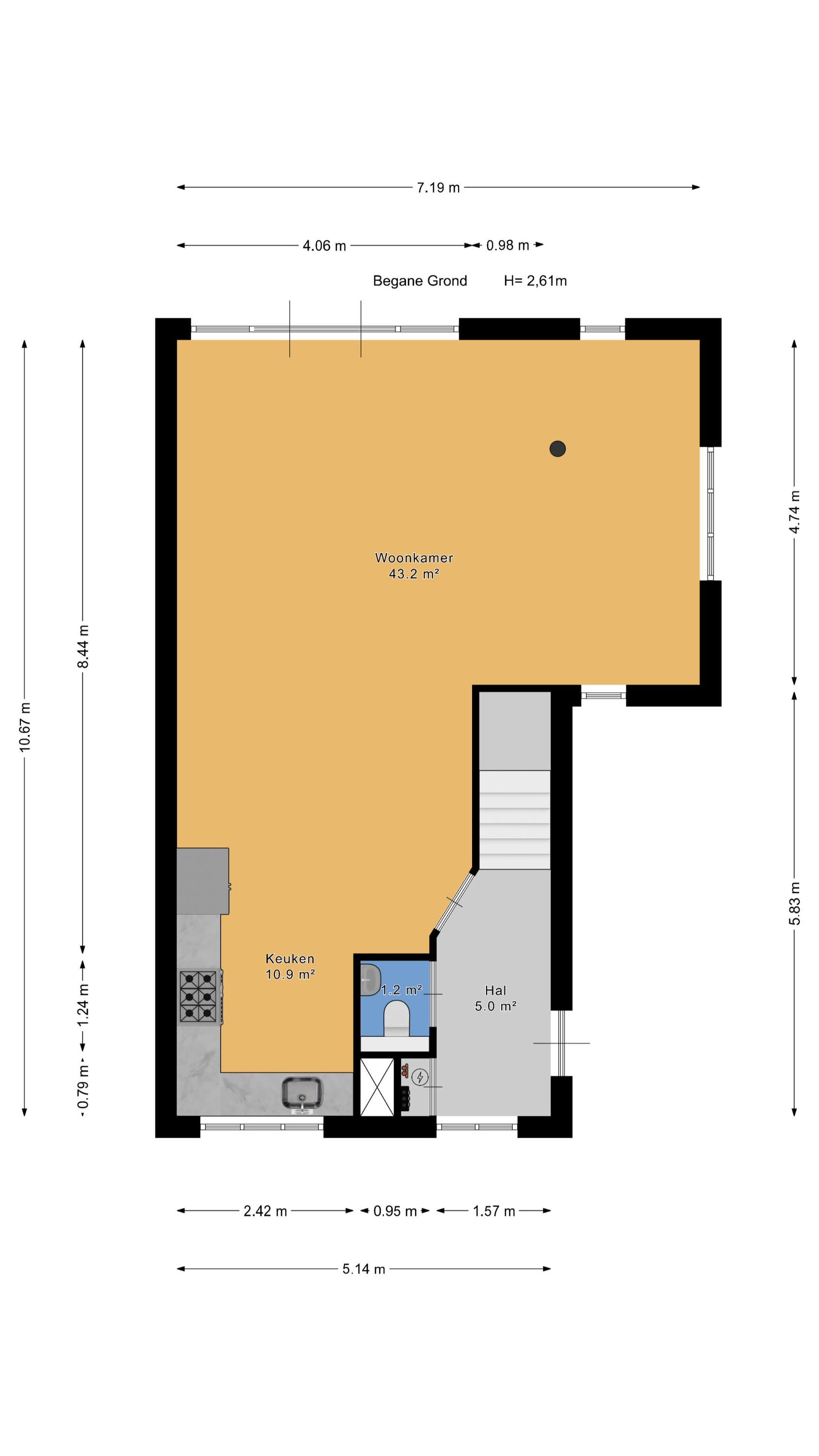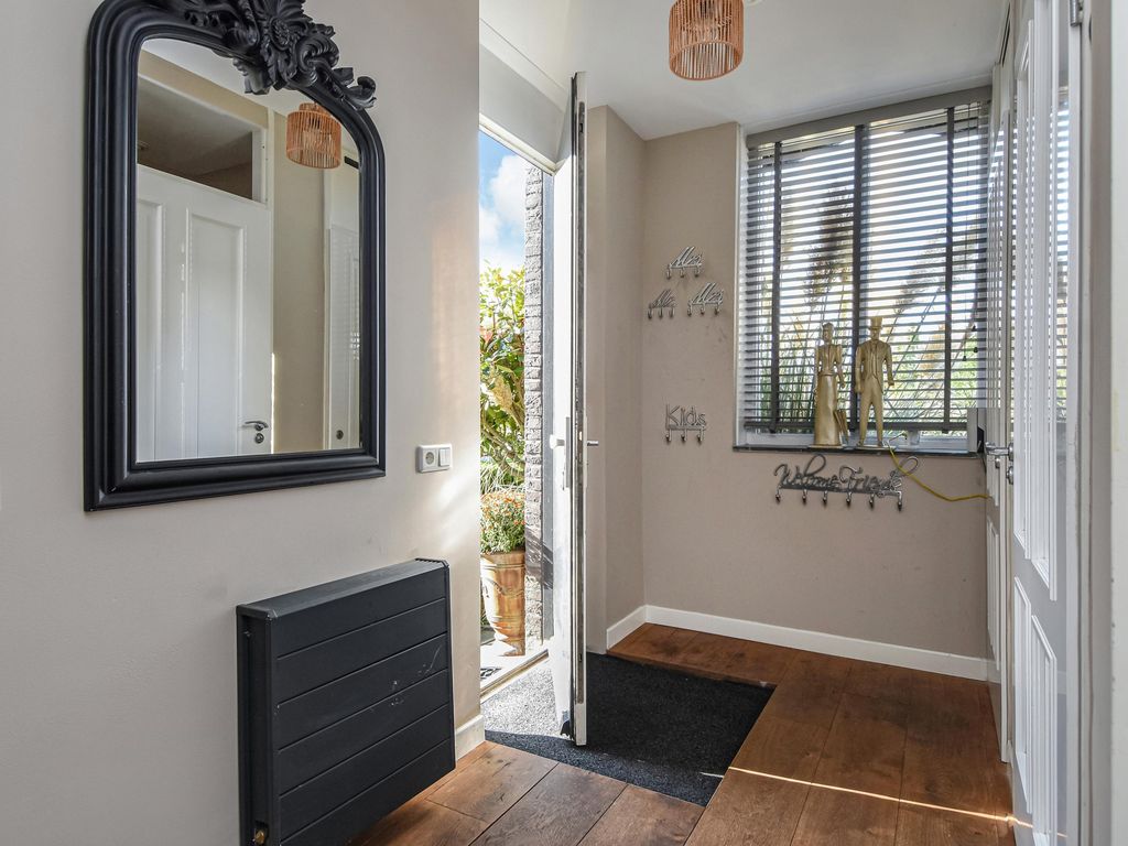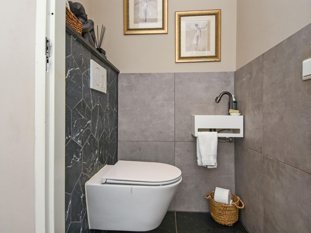 Toegang via zij-entree en ruime hal met modern toilet en meterkast.