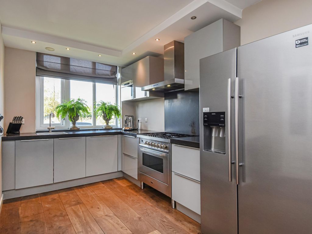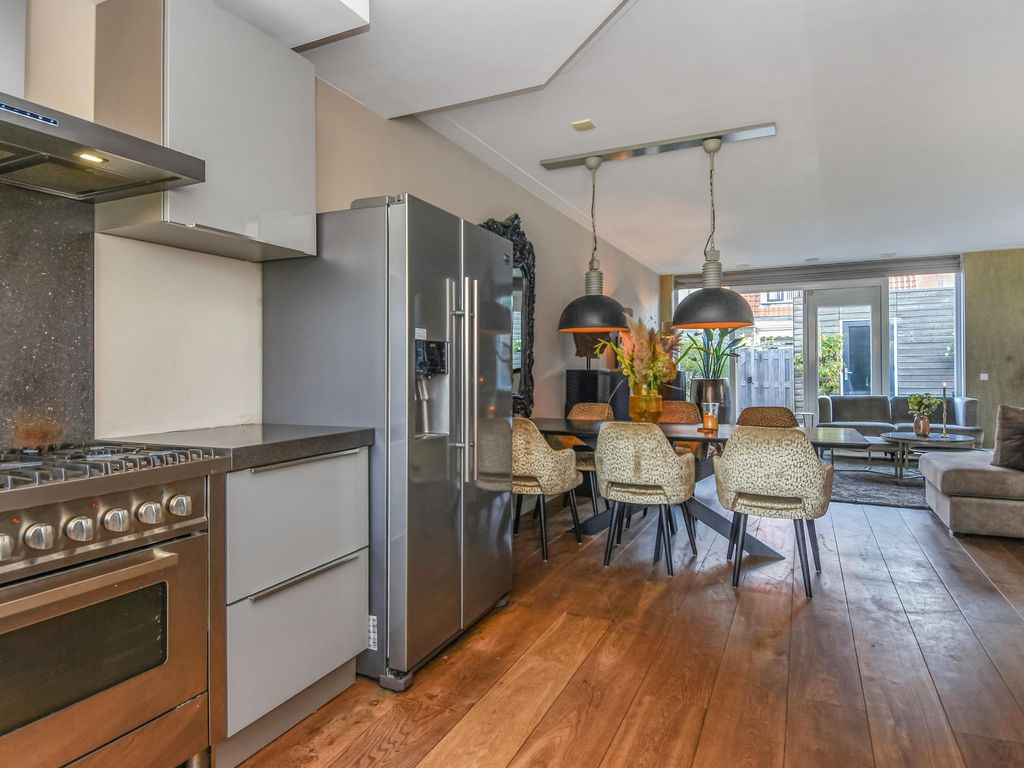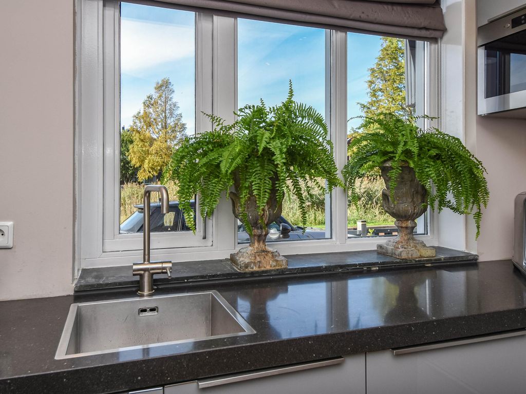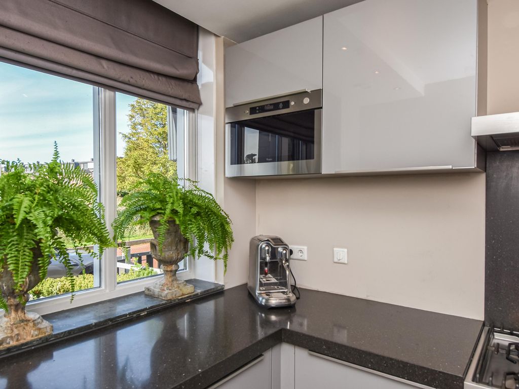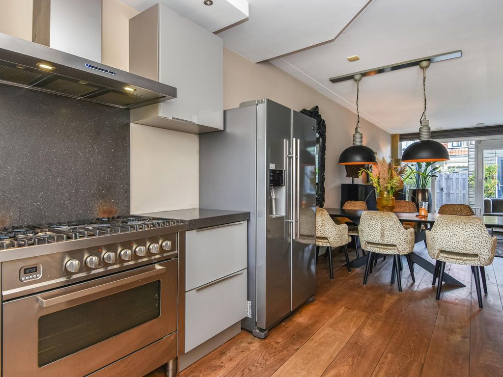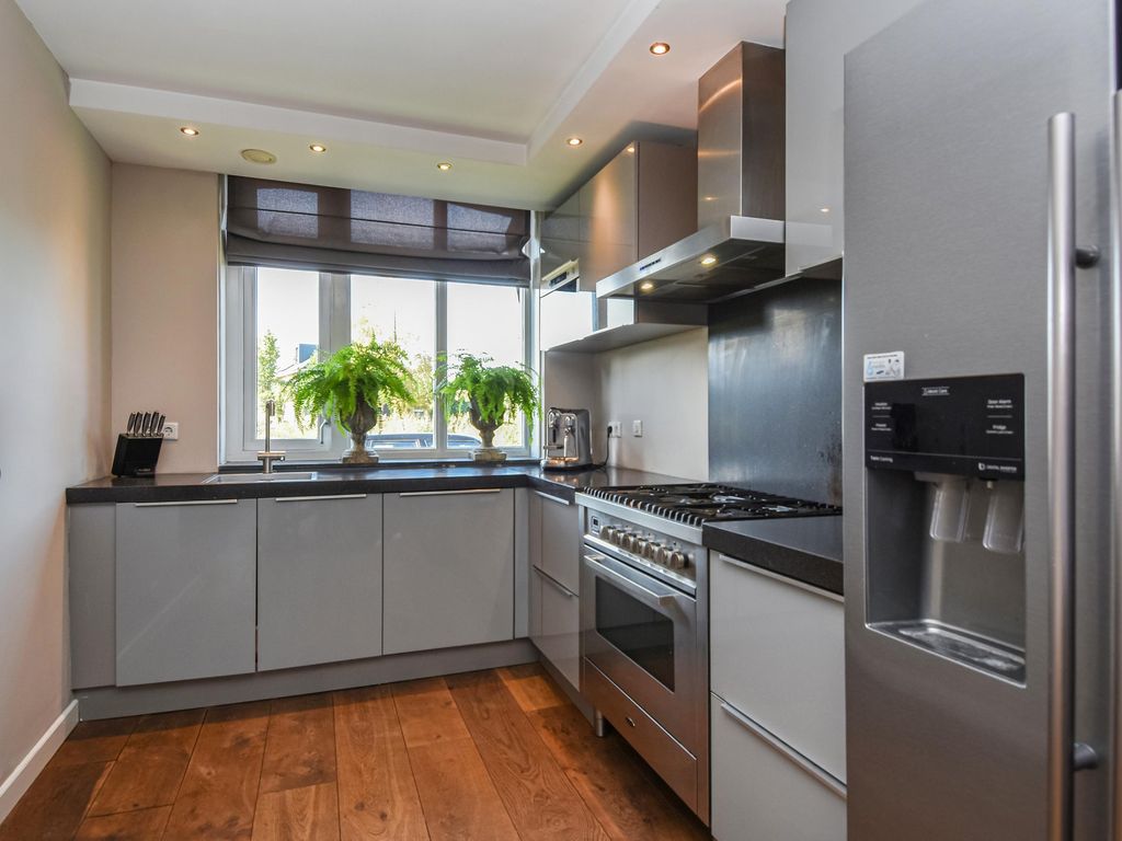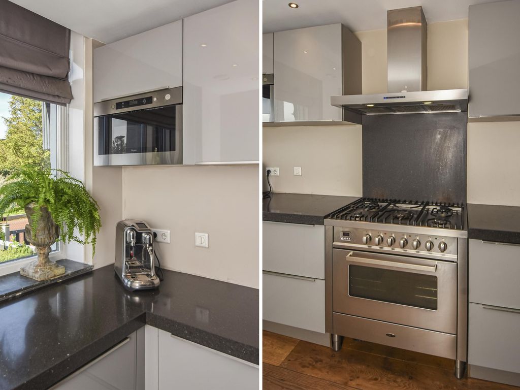 Moderne luxe keuken (ca. 4.50 x 2.42m) in hoekopstelling met onder- en bovenkasten, 5-pits gaskookplaat, afzuigkap, oven, combi magnetron, Amerikaanse koelkast en vaatwasser.