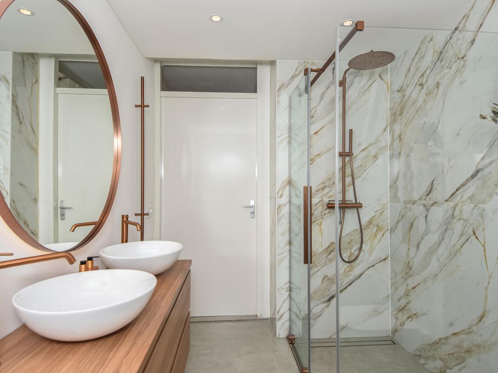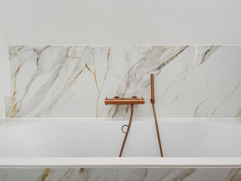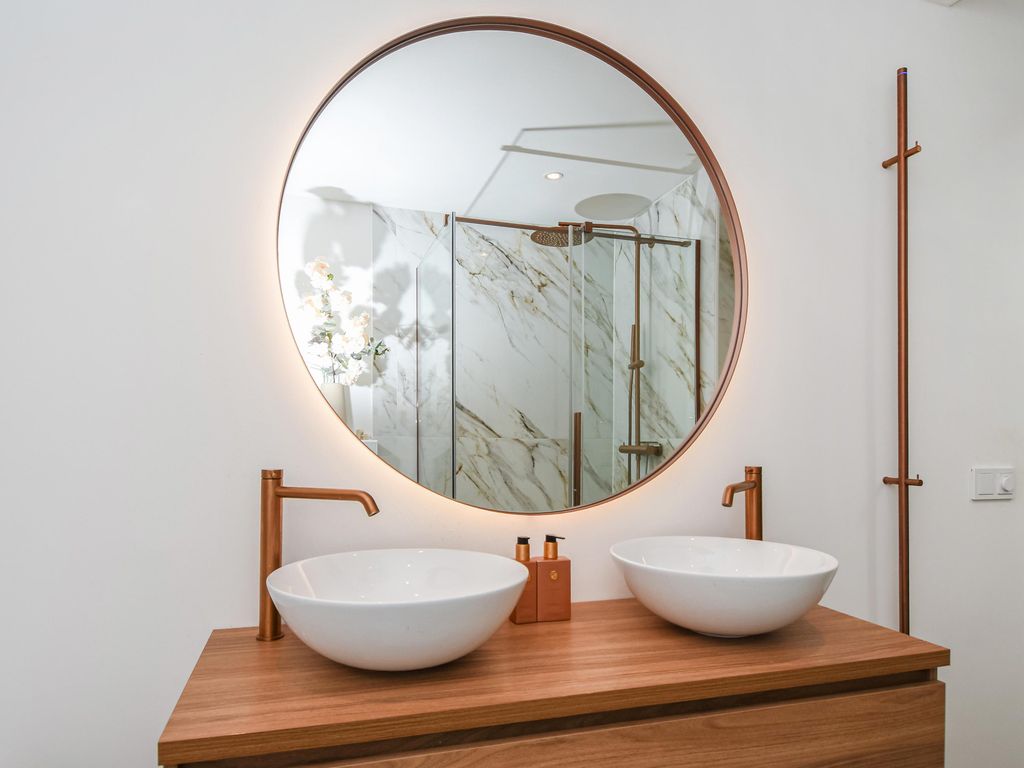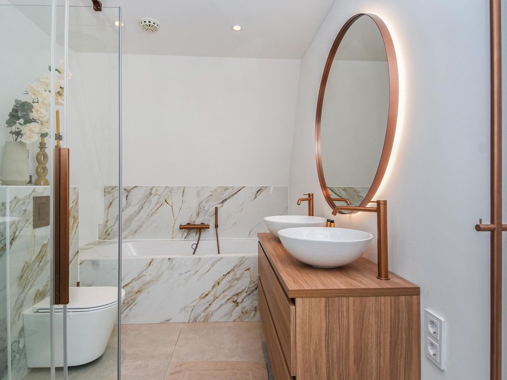 Fraaie luxe badkamer (ca. 3.13 x 2.06m) met ligbad, separate douche, dubbele wastafel en elektrische handdoekverwarmer.