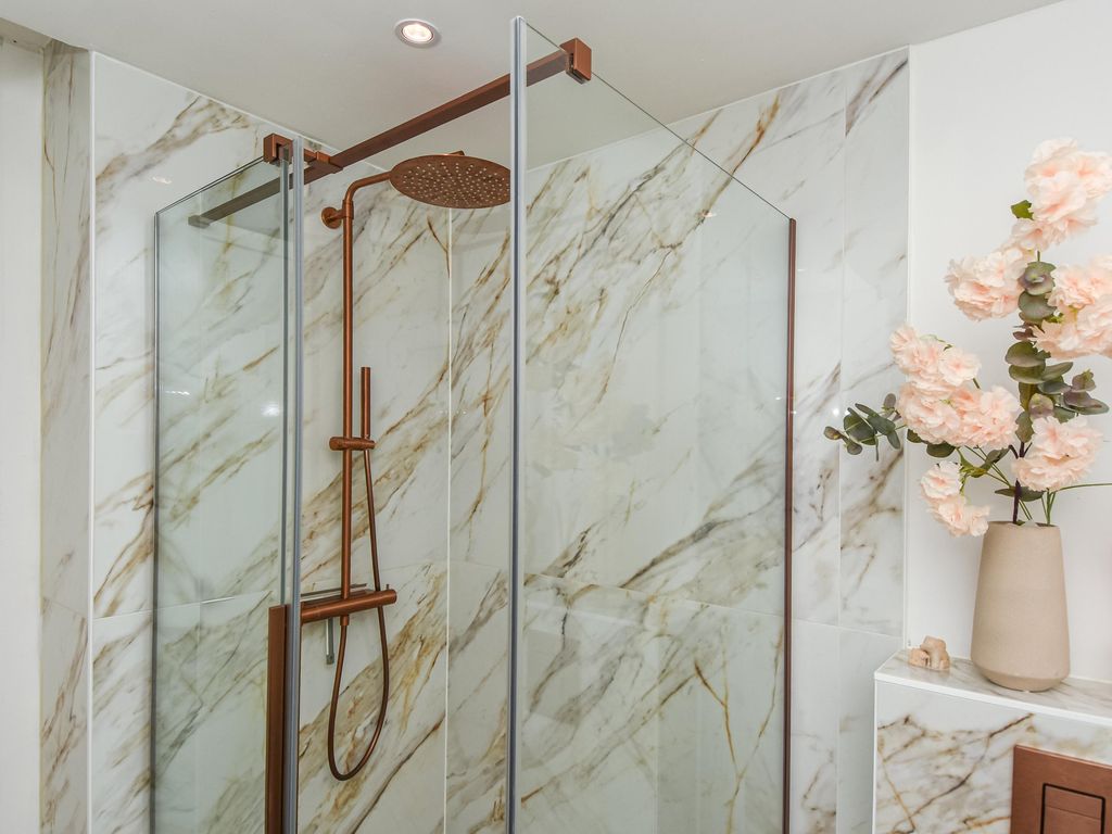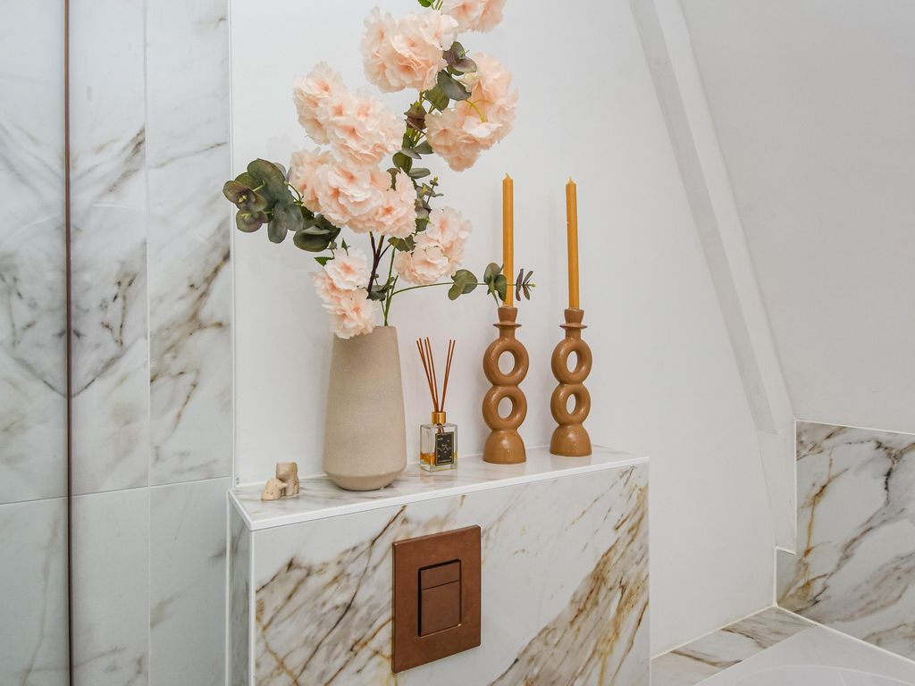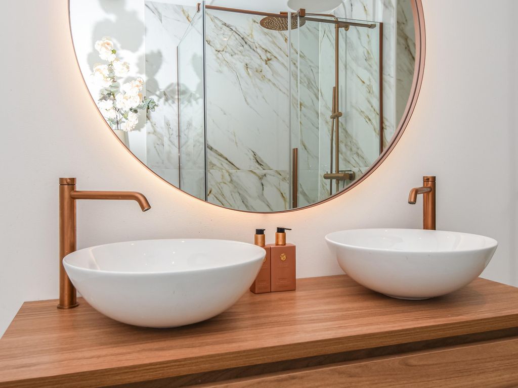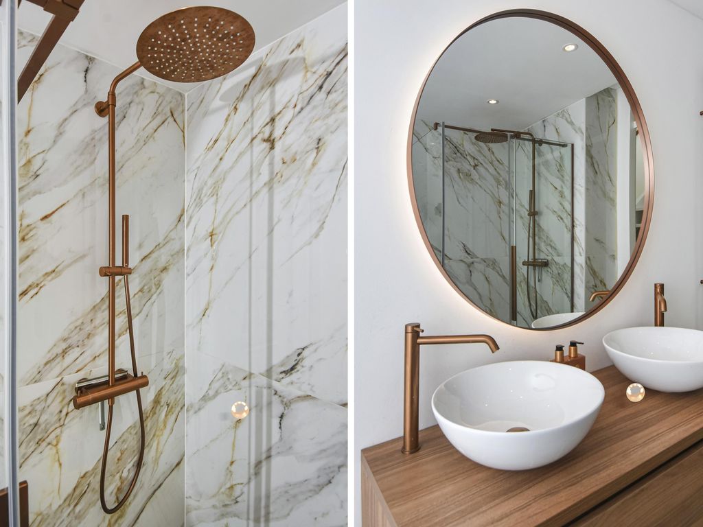 Fraaie luxe badkamer (ca. 3.13 x 2.06m) met ligbad, separate douche, dubbele wastafel en elektrische handdoekverwarmer.