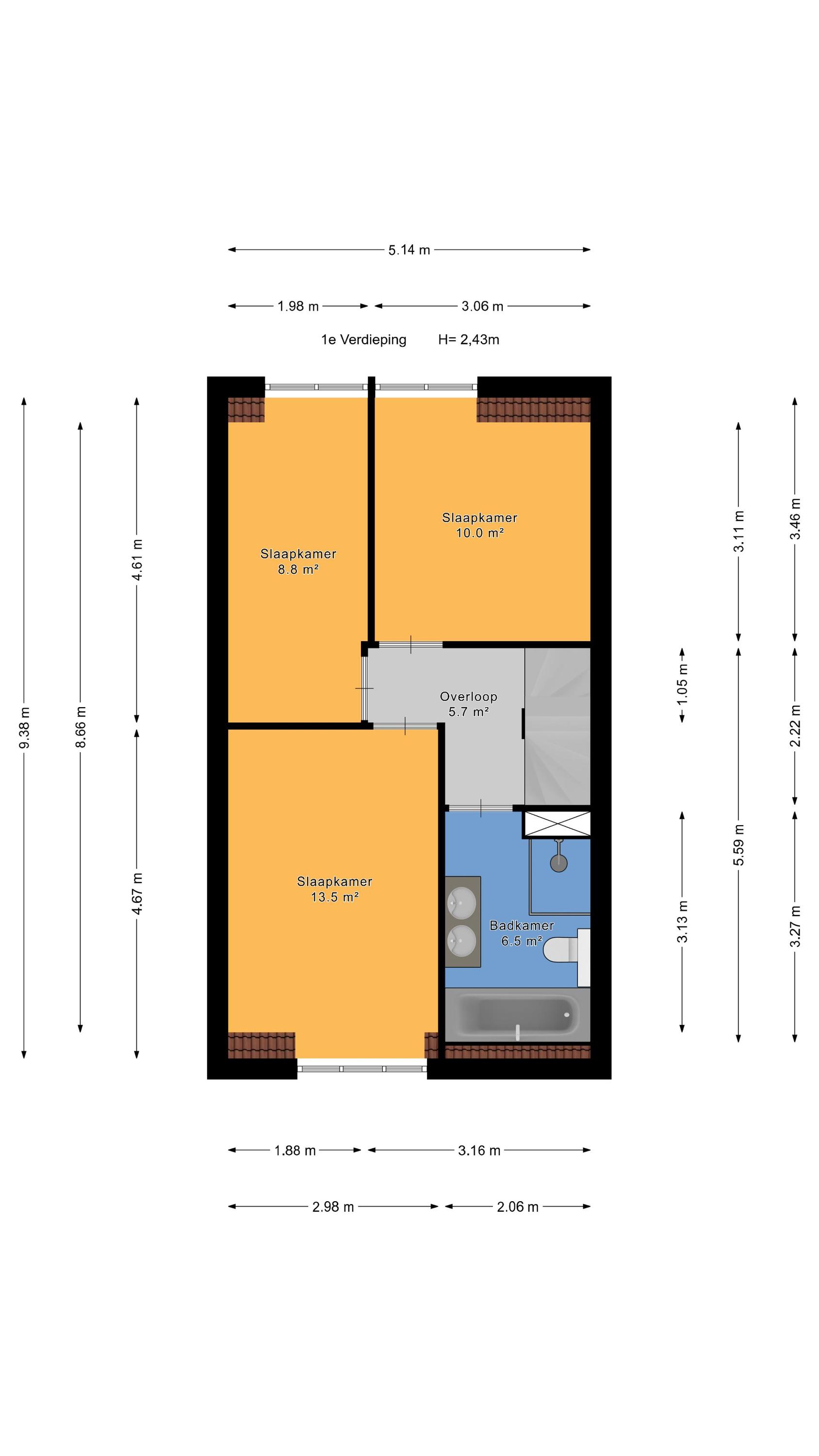 Grote voorslaapkamer (ca. 4.67 x 2.98m).