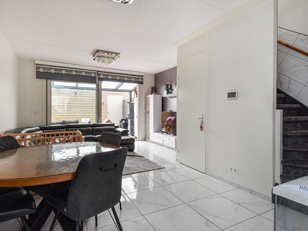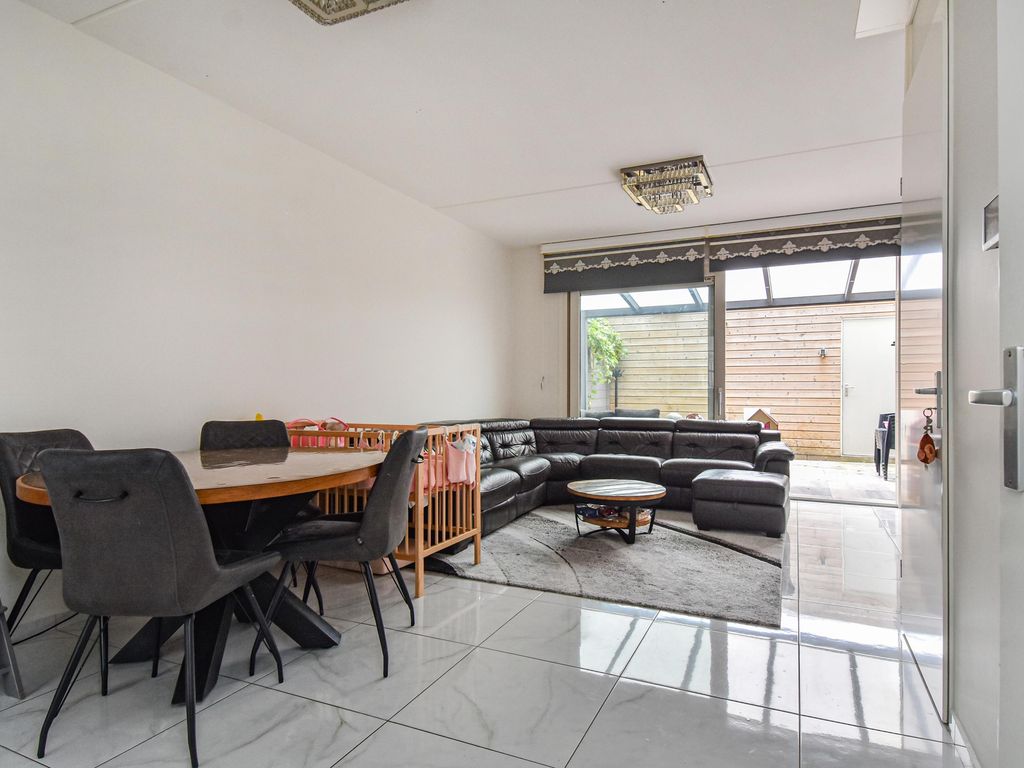 Ruime tuingerichte wooneetkamer (ca. 6.24 x 4.50m) met schuifpui naar de achtertuin.