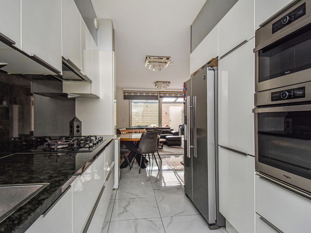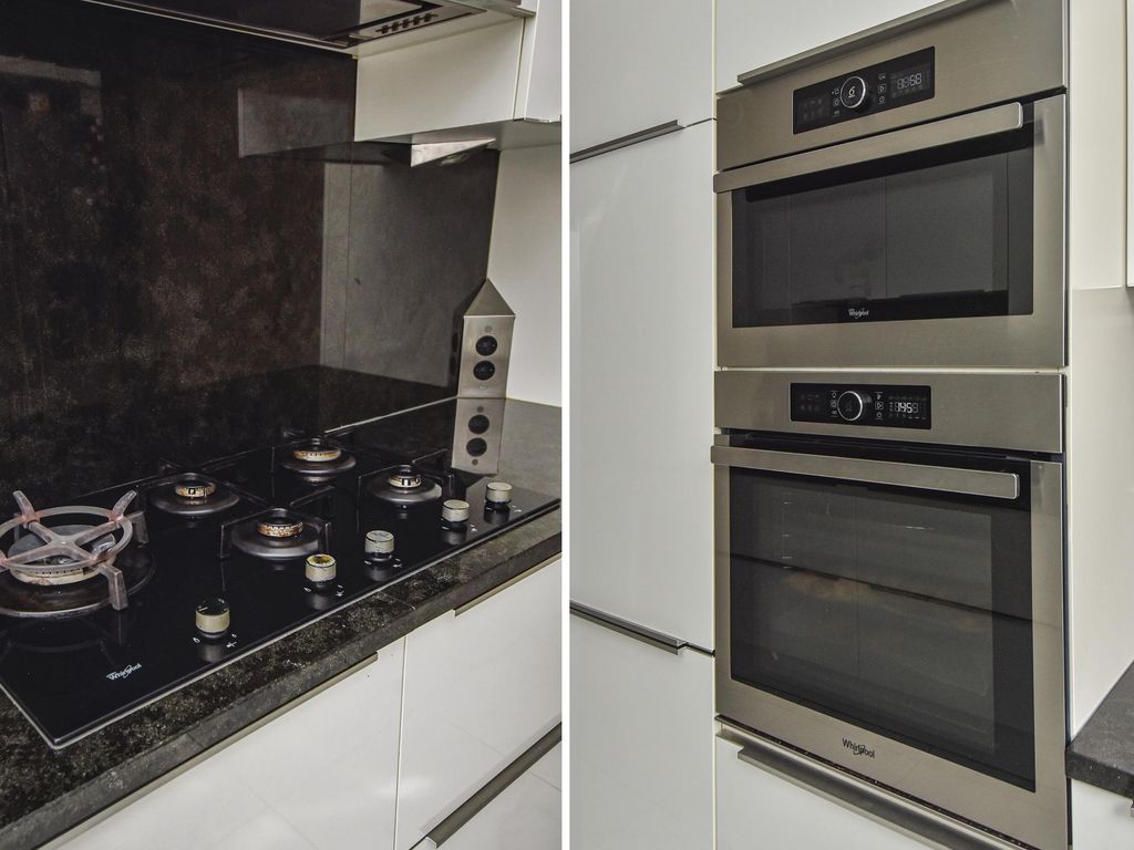 Moderne open keuken (ca. 3.75 x 2.40m) met onder- en bovenkasten, 5-pits gaskookplaat, afzuigkap, oven, combi magnetron, koelkast, vriezer en vaatwasser.