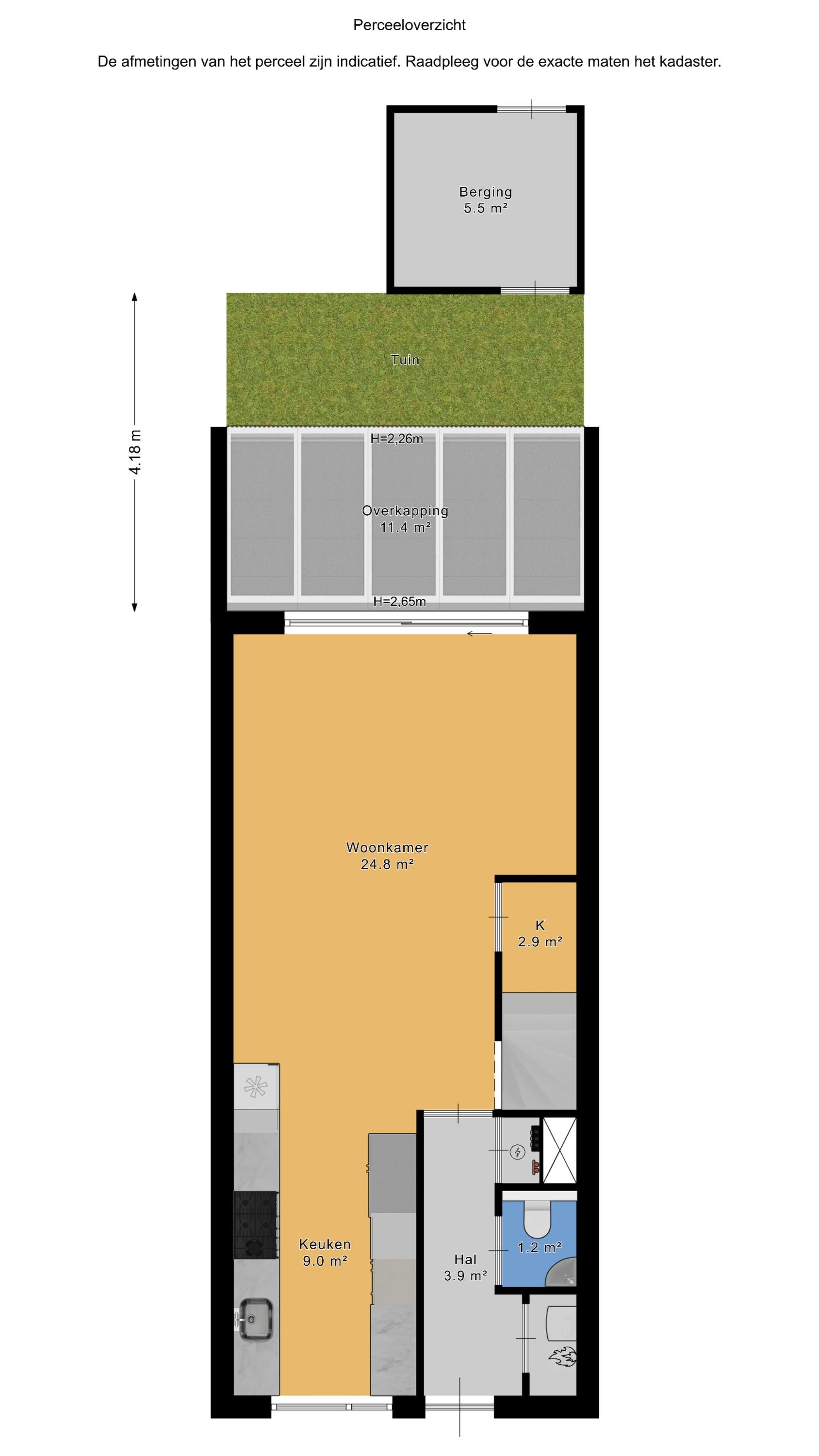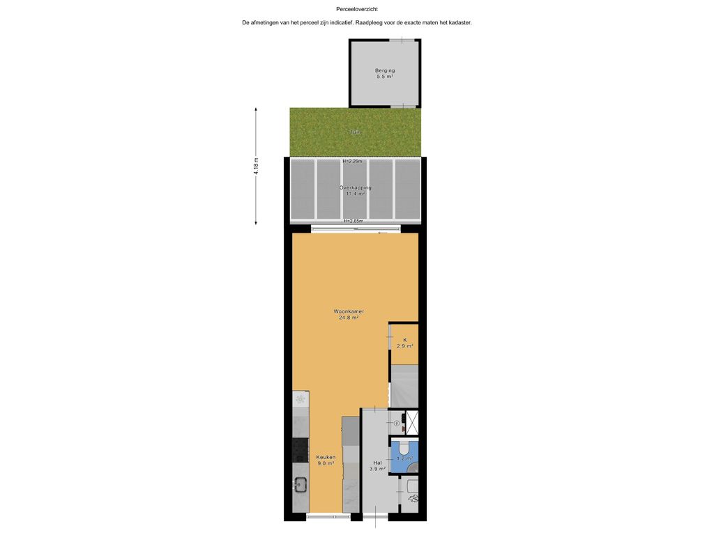 Achtertuin (ca. 4.69 x 4.18m) met achterom en houten berging (ca. 2.40 x2.28m) met elektra.