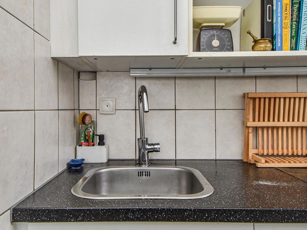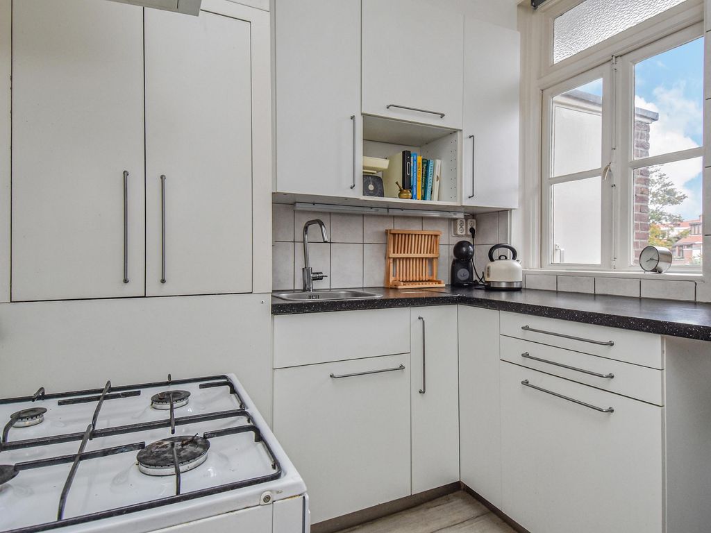 Nette keuken (ca. 2.98 x 2.31m) met 4-pits gaskookplaat, afzuigkap en deur naar het balkon.