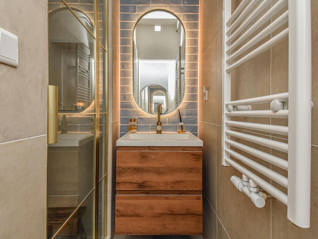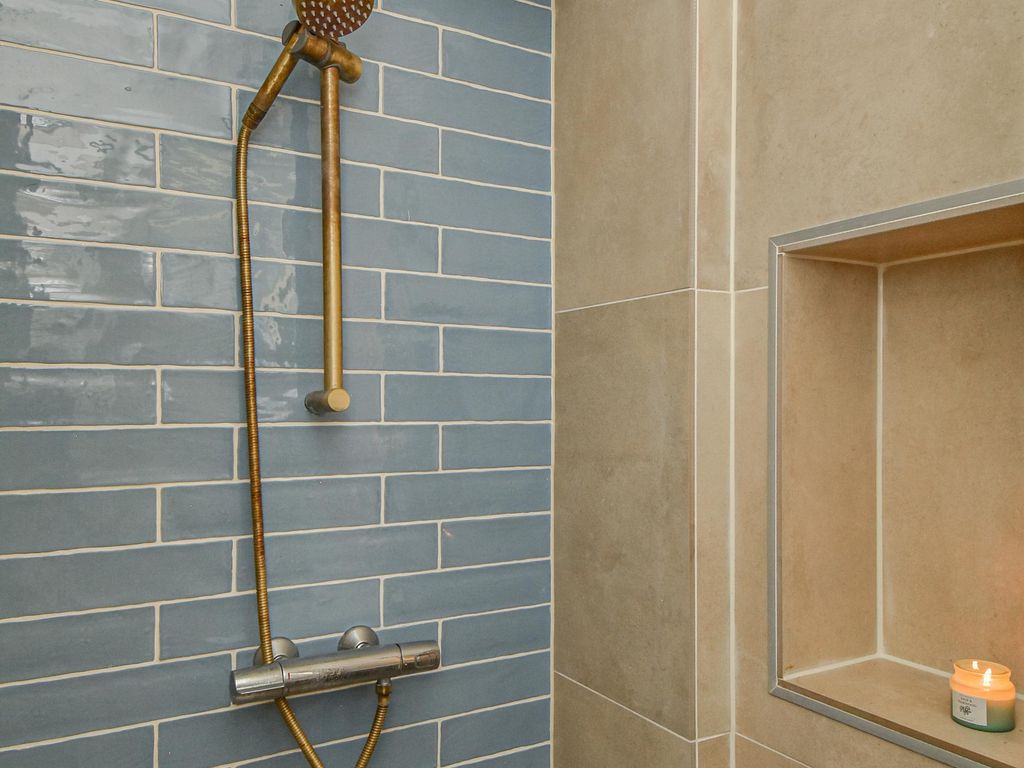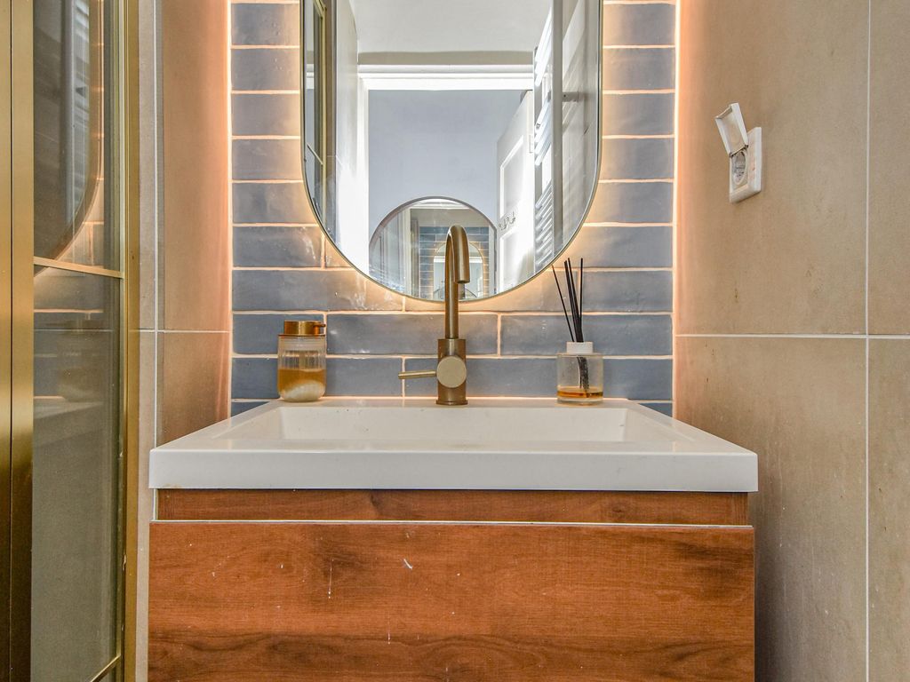 Mooie L-vormige badkamer (ca. 1.75 x 1.73m) met douche en wastafelmeubel.