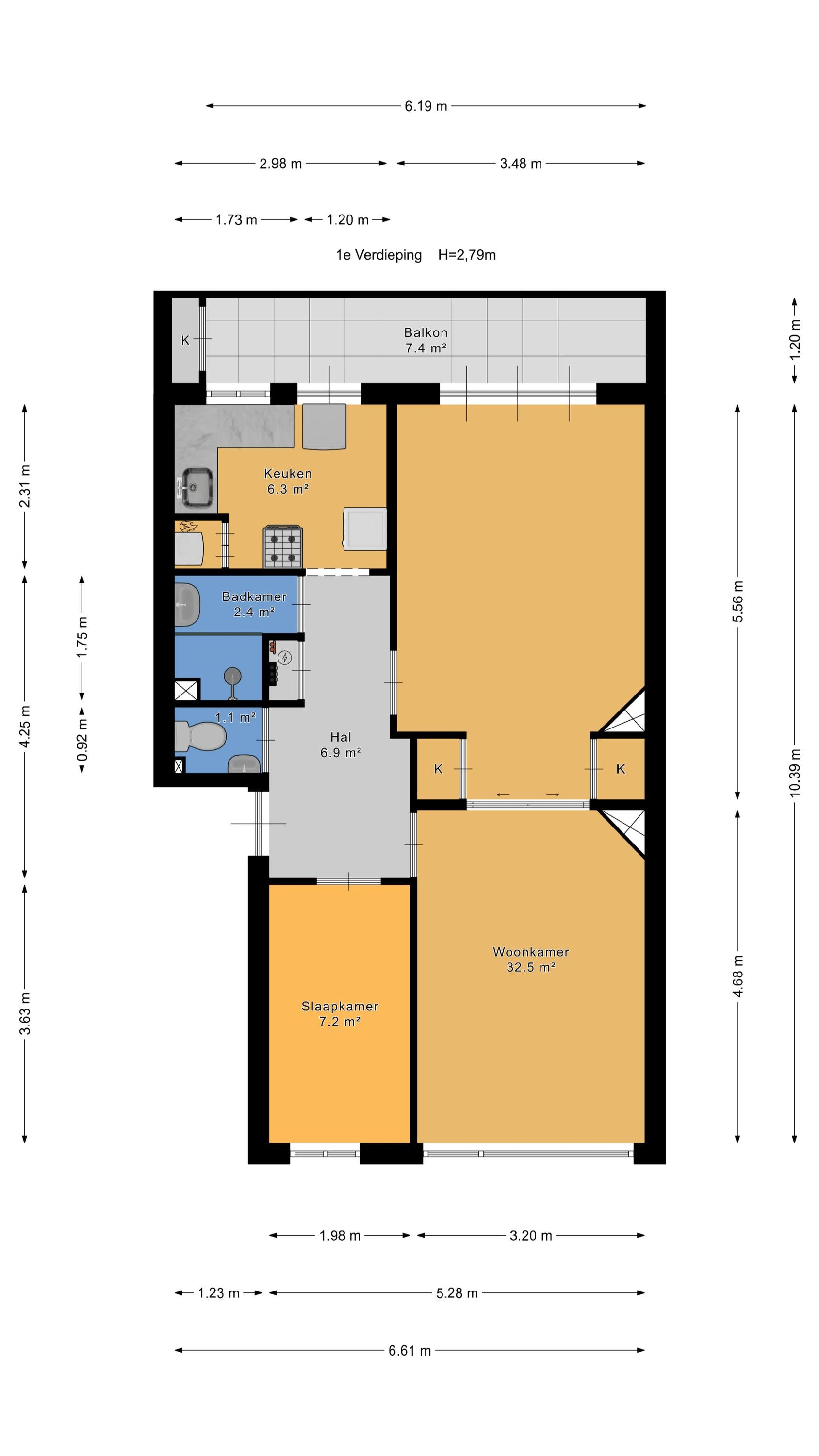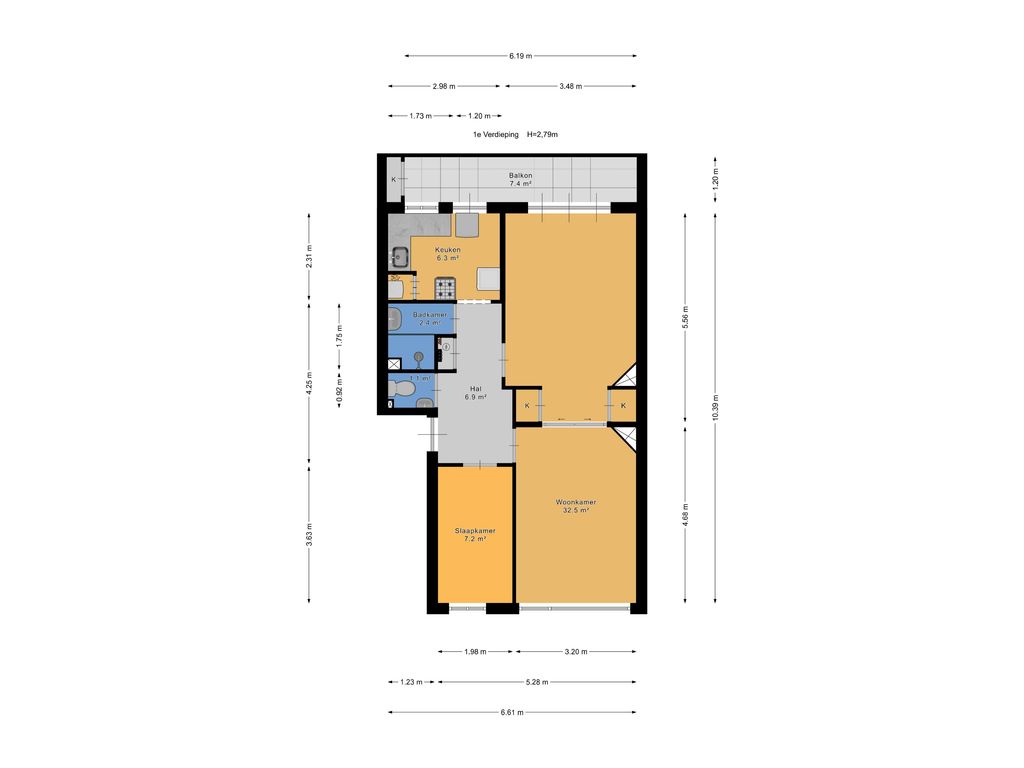 Ruim balkon (ca. 6.19 x 1.20) over de gehele breedte met balkonkast, gunstig geleden op de middag/avondzon.