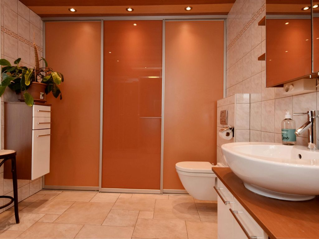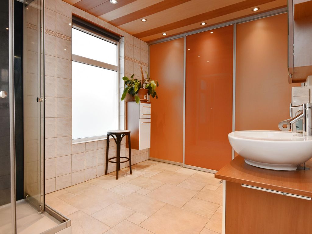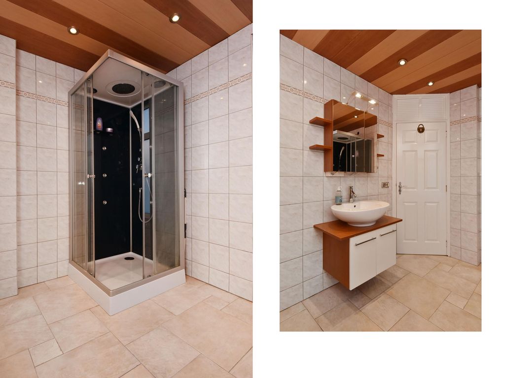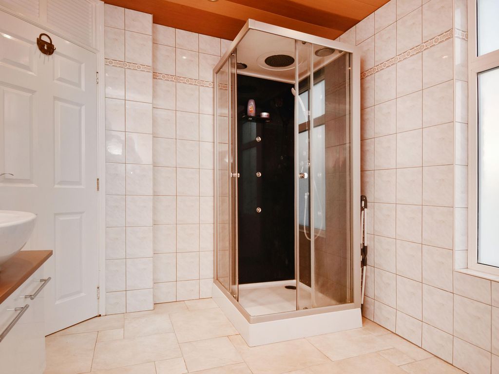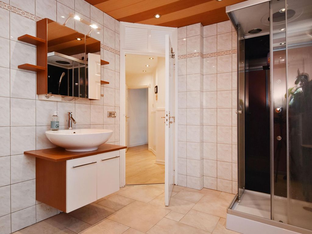 Grote badkamer (ca. 3.81 x 2.54m) met douche, toilet en wastafelmeubel.