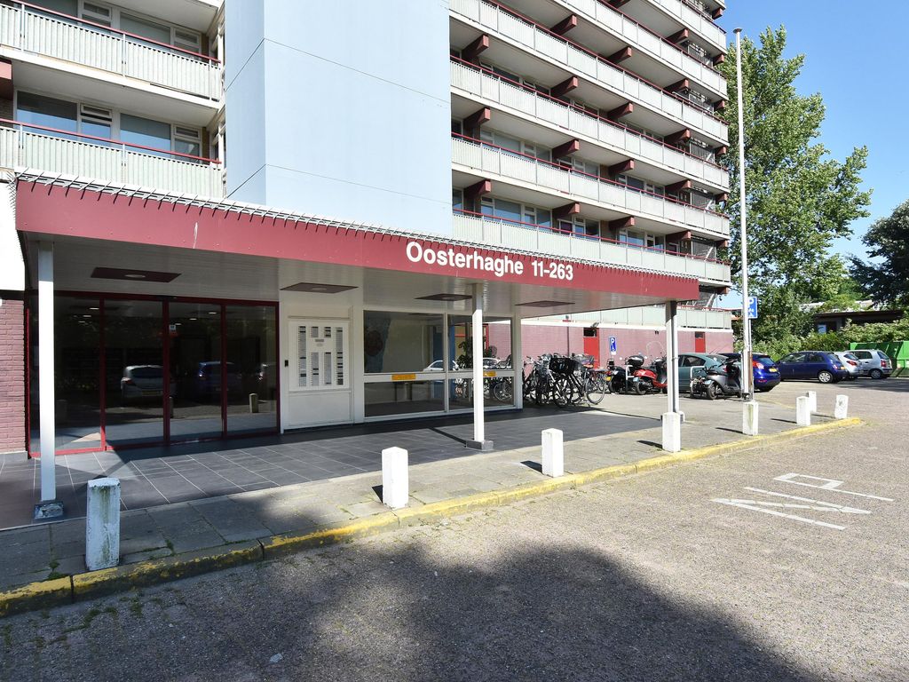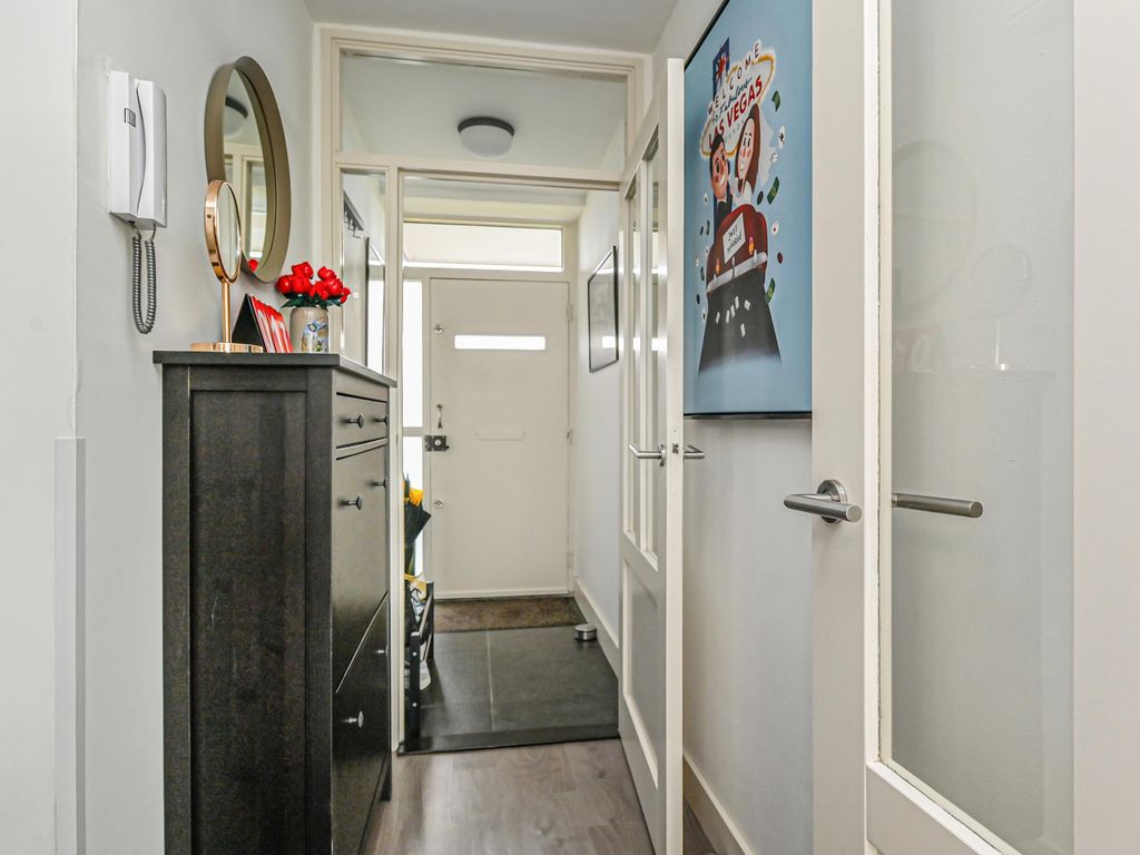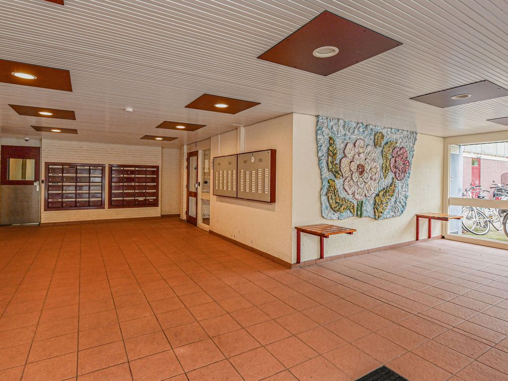 Toegang via gesloten portiek met bellentableau, intercom en brievenbussen.
