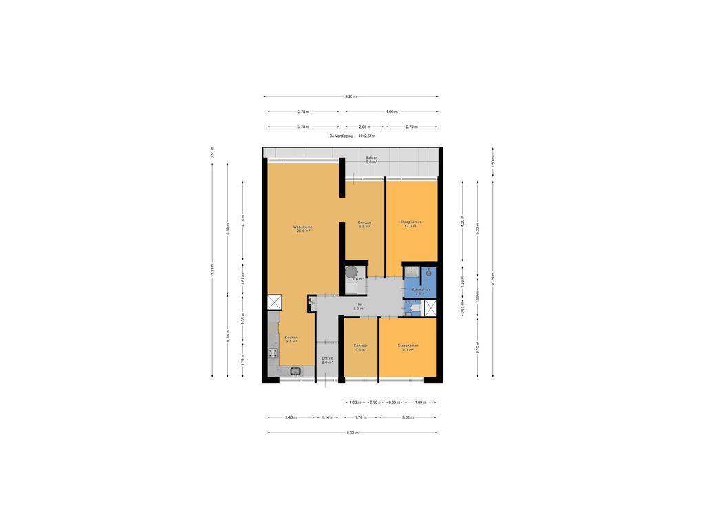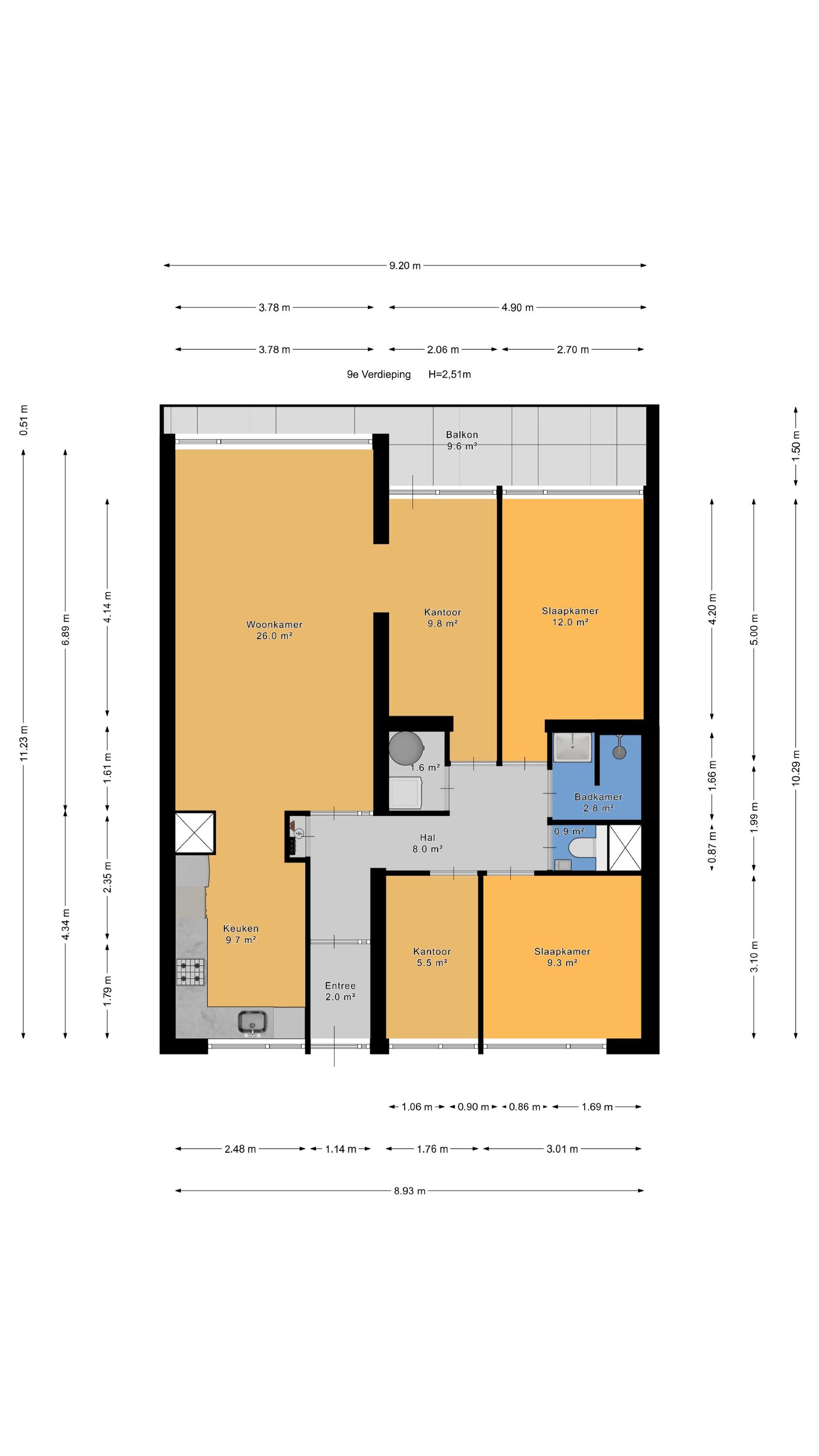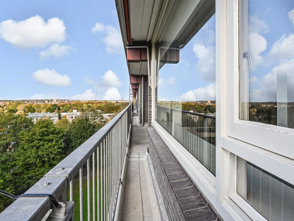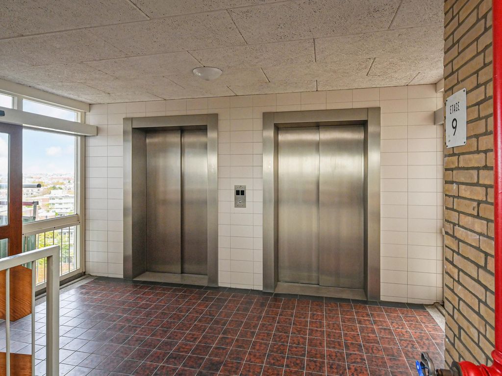 Via trap of lift bereik je de 9e etage, alwaar galerij, entree woning, hal met meterkast en modern toilet.