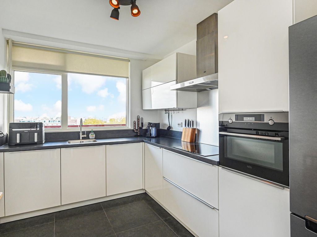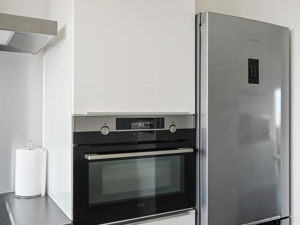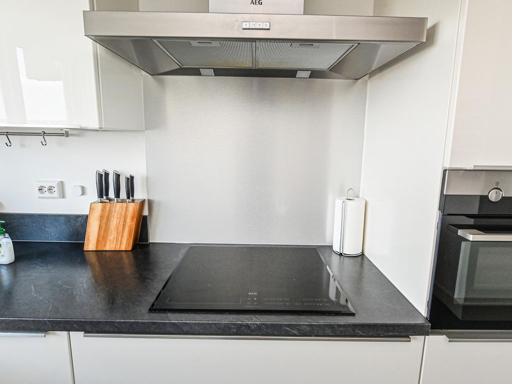 Moderne luxe keuken (ca. 4.34 x 2.48m) met keukenblok in hoekopstelling met onder- bovenkasten, 4-pits inductiekookplaat, afzuigkap, combimagnetron, koelkast, vriezer en vaatwasser.