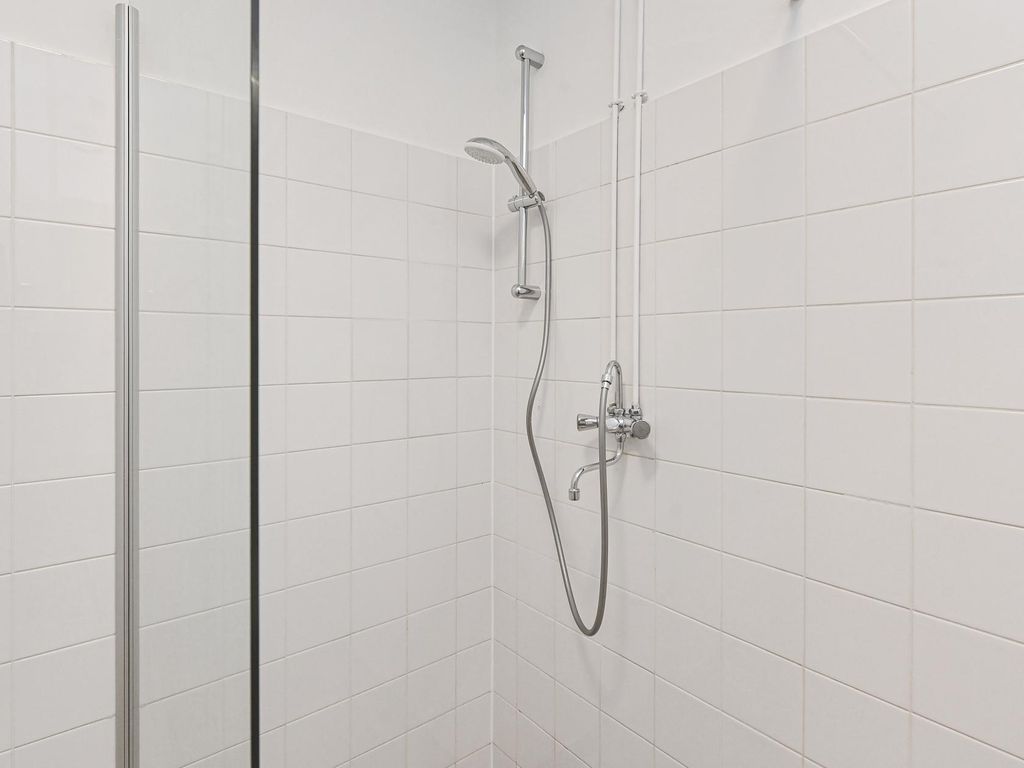 Ruime badkamer (ca. 2.09 x 1.89m) met douche, wastafel en spiegelkast met verlichting.