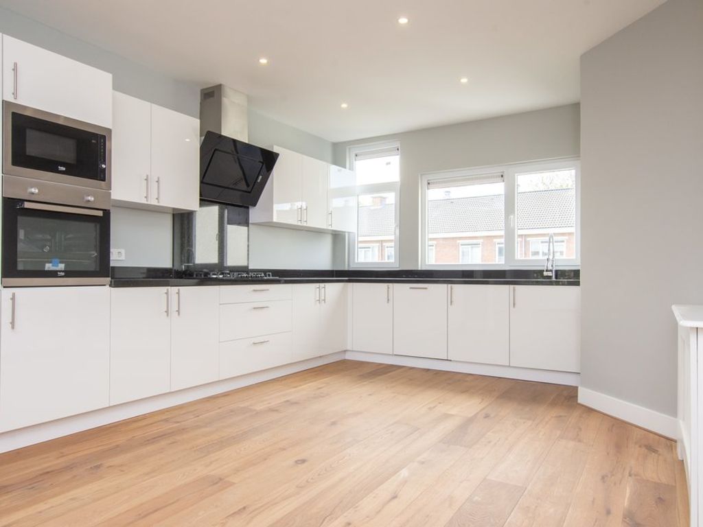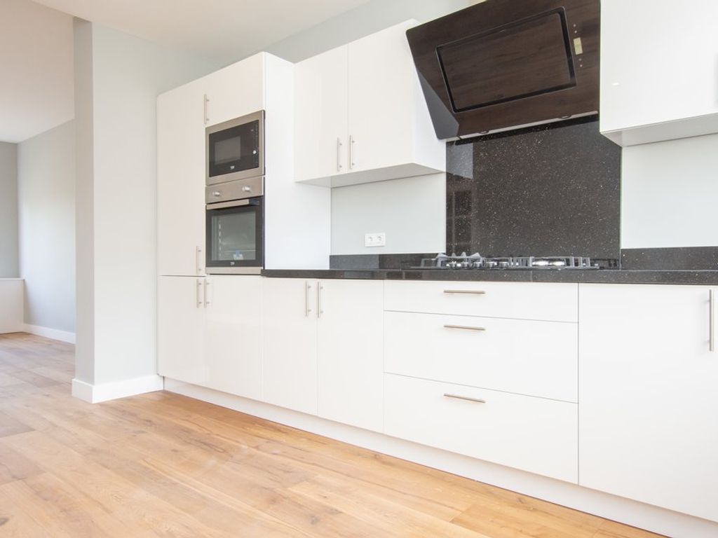 Fraaie luxe open keuken (ca. 4.61 x 3.01m) in hoekopstelling en voorzien van onder- en bovenkasten, 5-pits gaskookplaat, afzuigkap, koel-/vriescombinatie, vaatwasser, dubbele oven en natuurstenen werkblad.