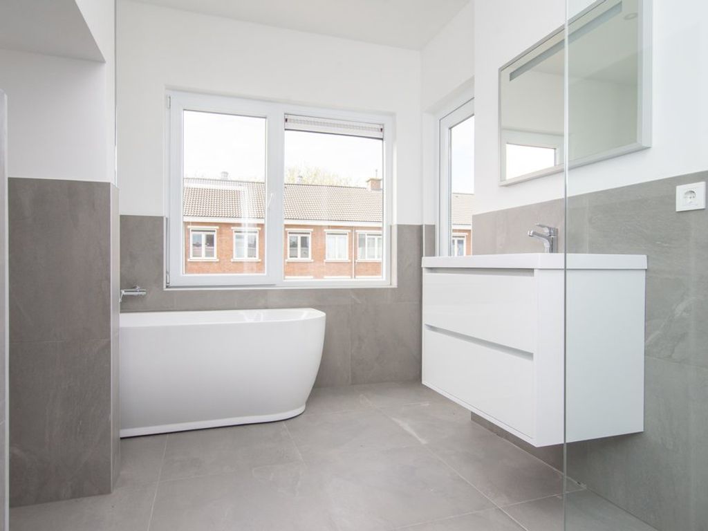 Fraaie luxe badkamer (ca. 3.44 x 1.82m) voorzien van ligbad, separate douche met regendouche, wastafel met onderkast, designradiator en wasmachineaansluiting.