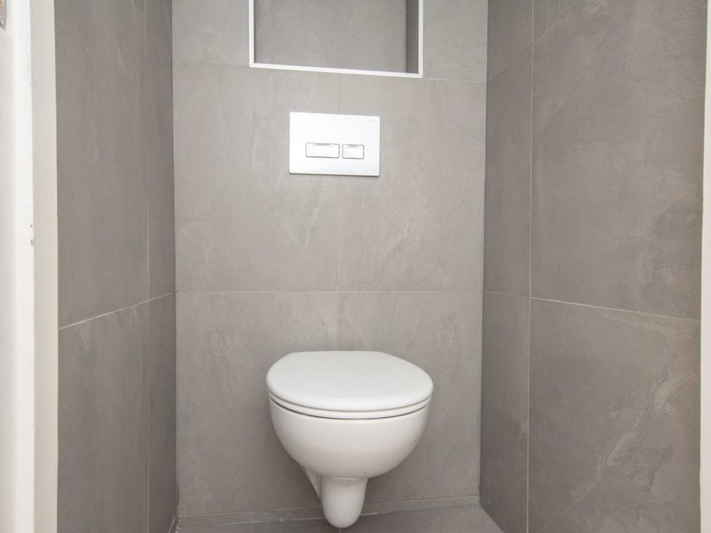 Toegang via gesloten portiek, trap naar topetage, entree woning, L-vormige gang met modern toilet en vaste kast.