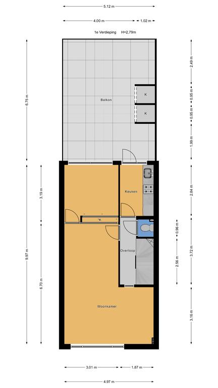 Zeer groot zonneterras (ca. 6.75 x 5.12m) gunstig gelegen op de middag/avondzon.