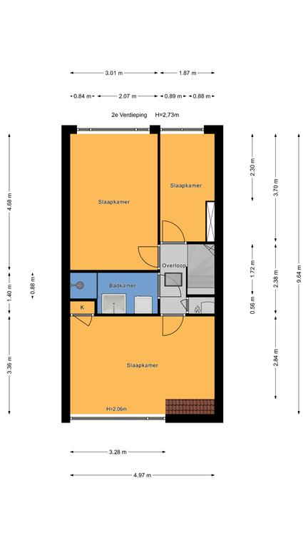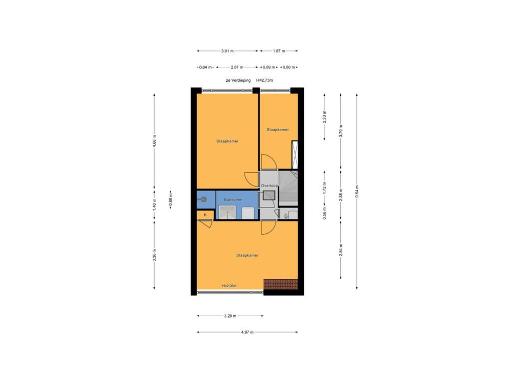 Grote voorslaapkamer (ca. 4.97 x 3.36/2.84m) met dakkapel