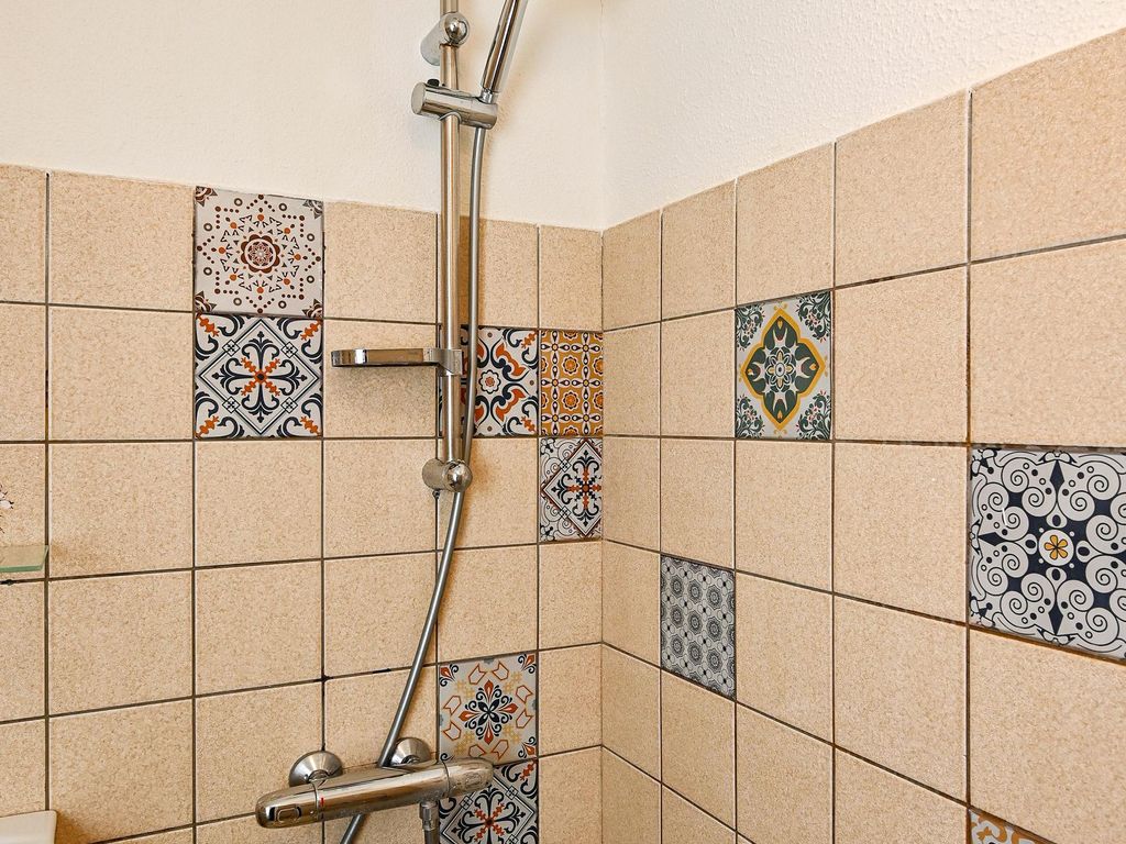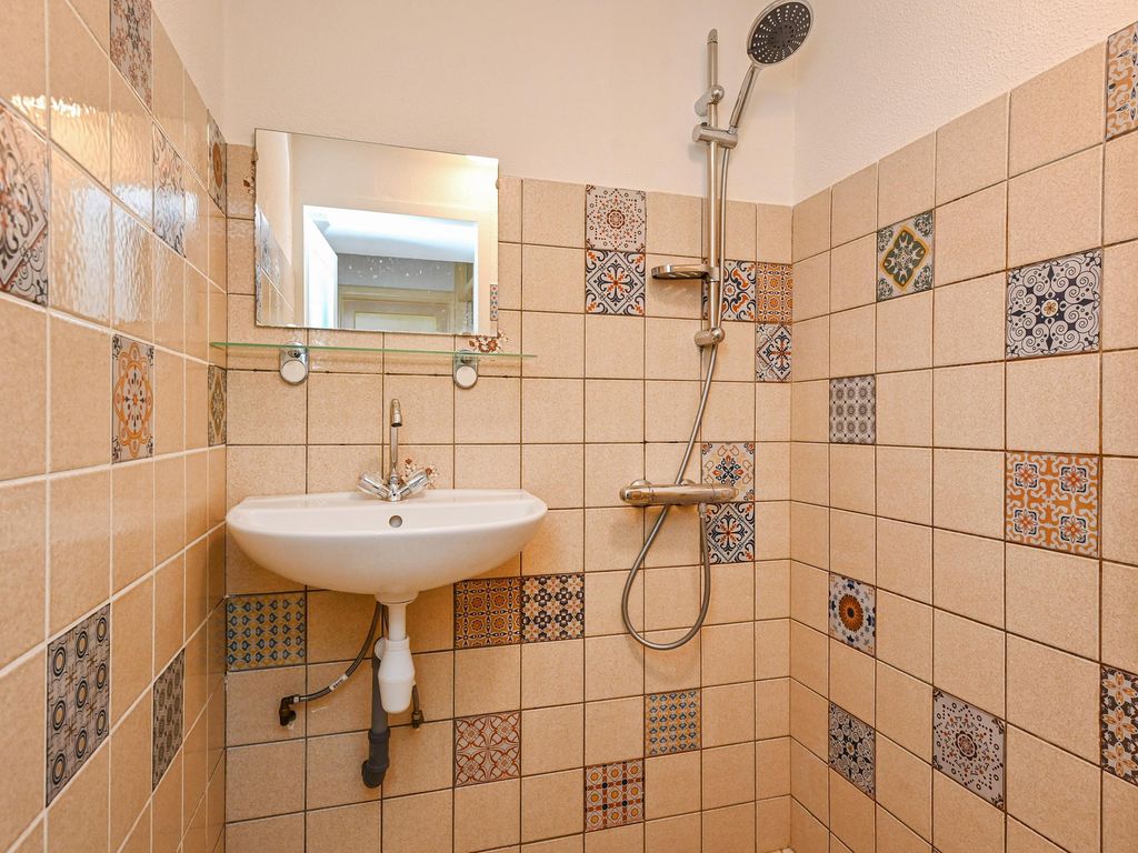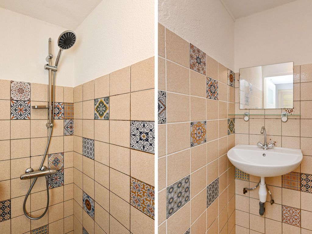 Eenvoudige badkamer (ca. 1.34 x 1.23m) met douche en wastafel.