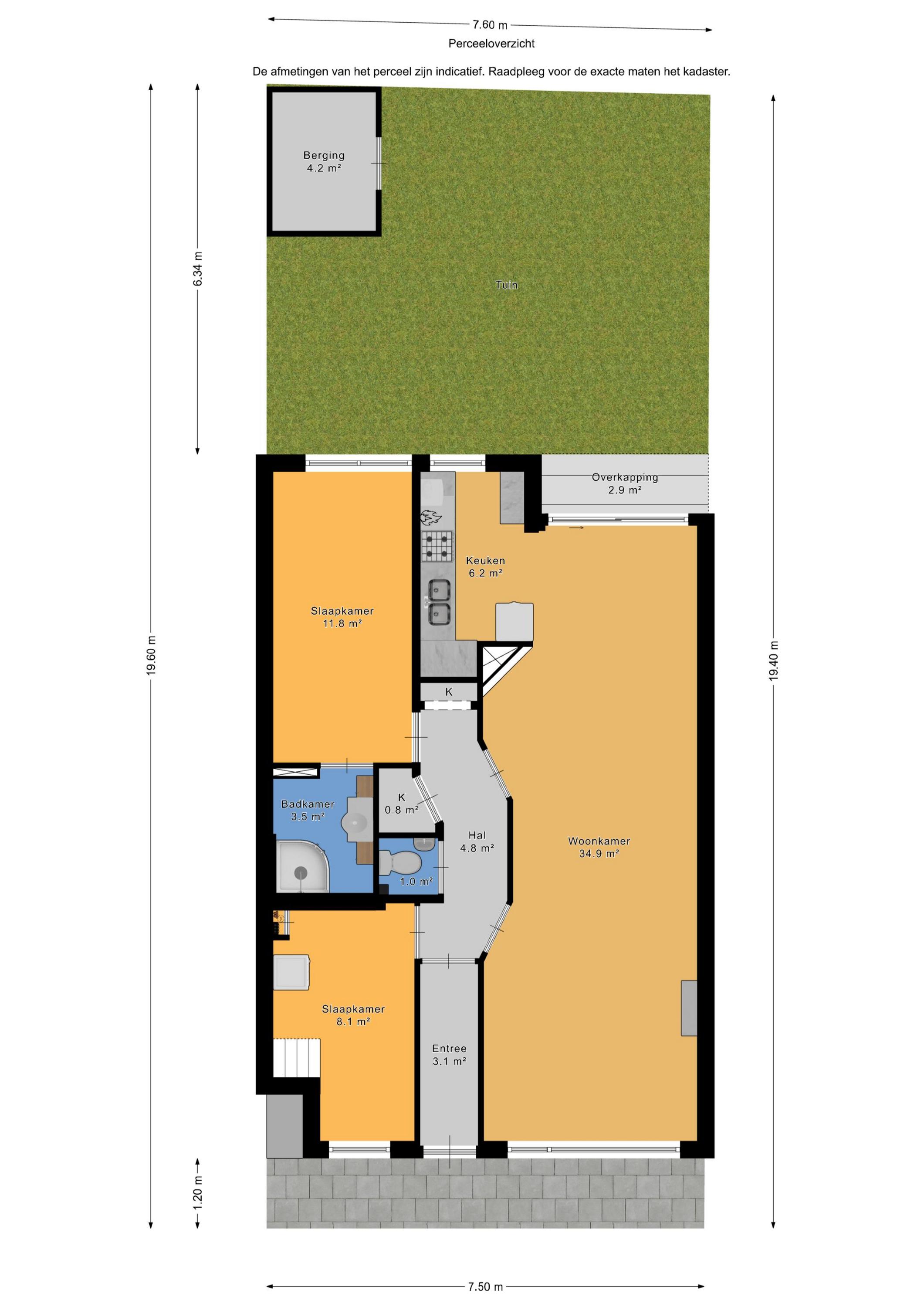 Ruime achtertuin (ca. 7.60 x 6.34m) met houten schuur met elektra.