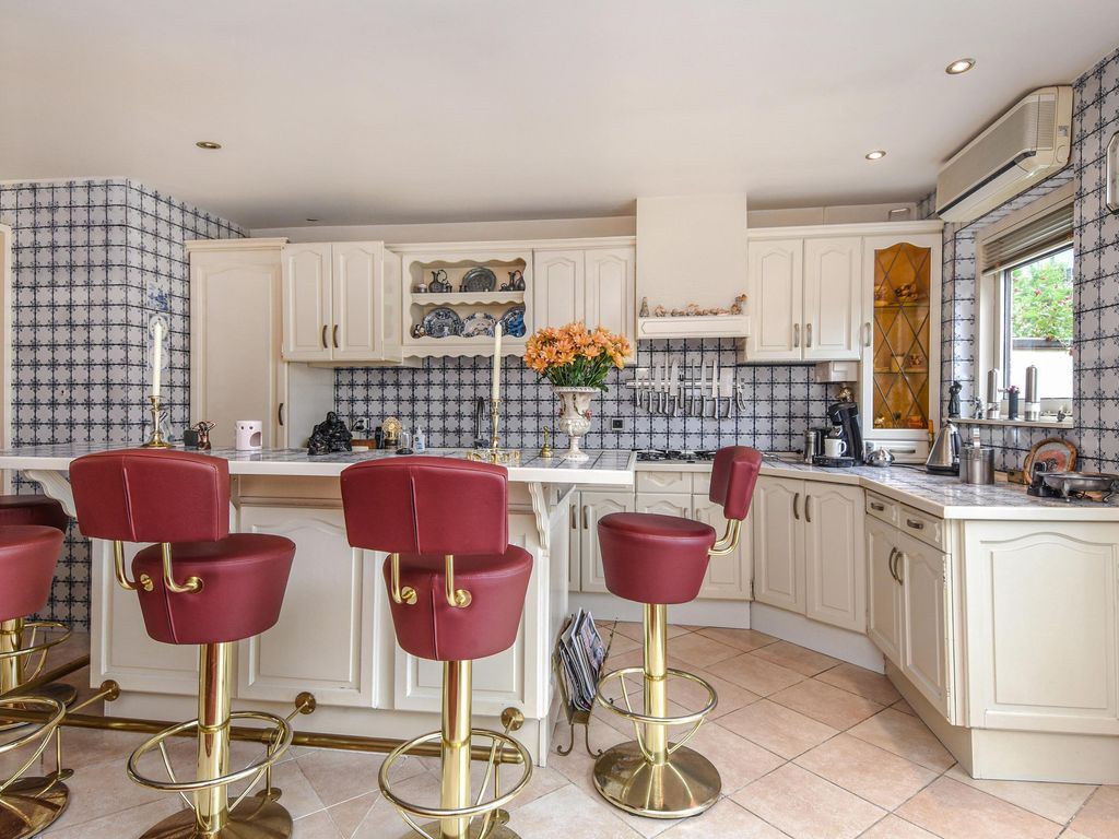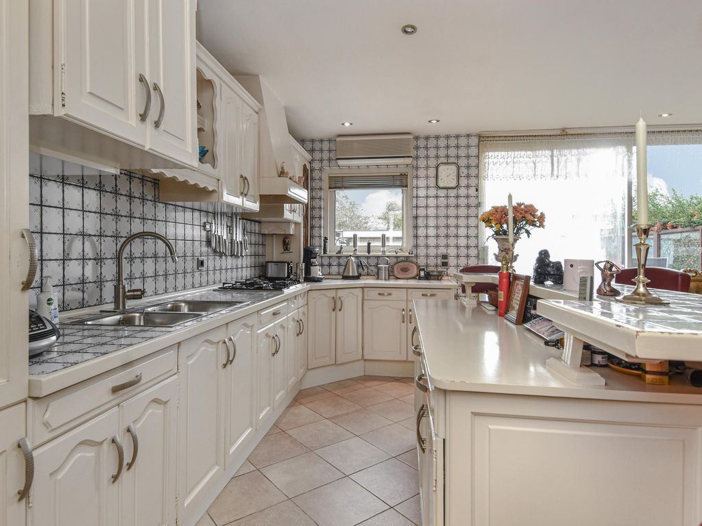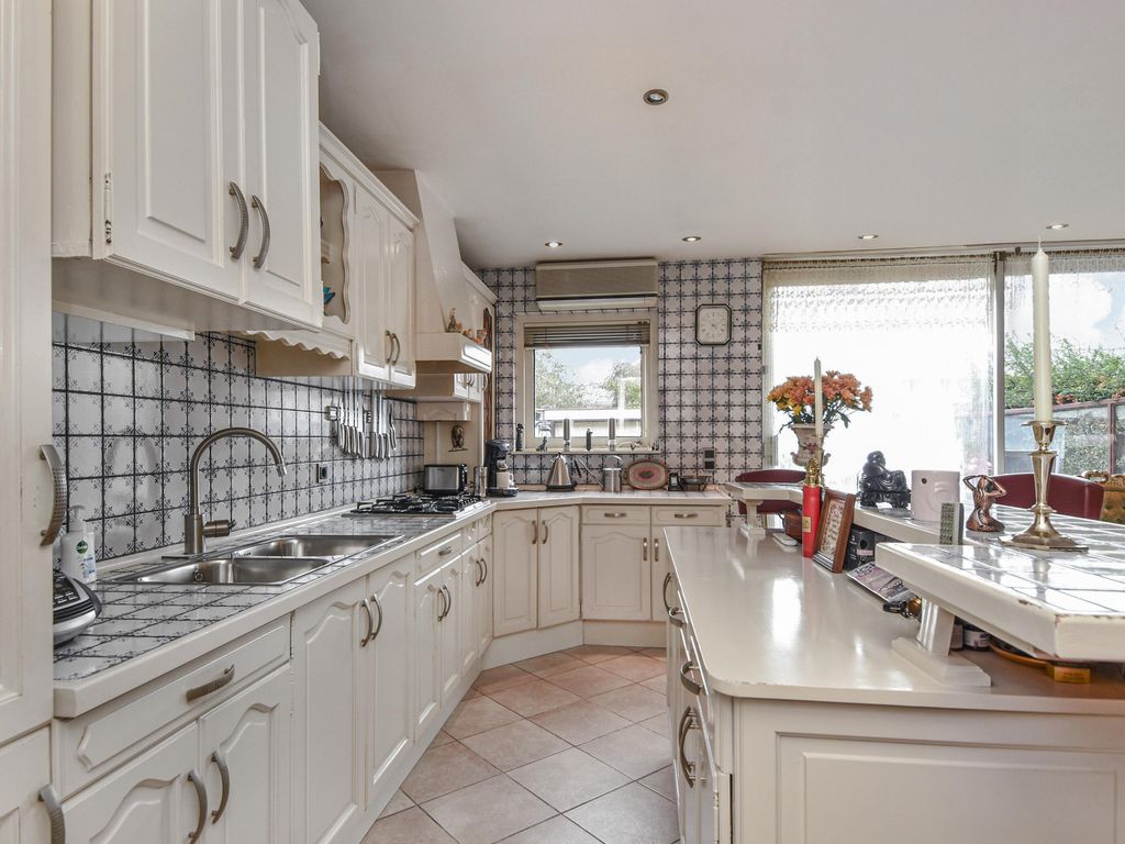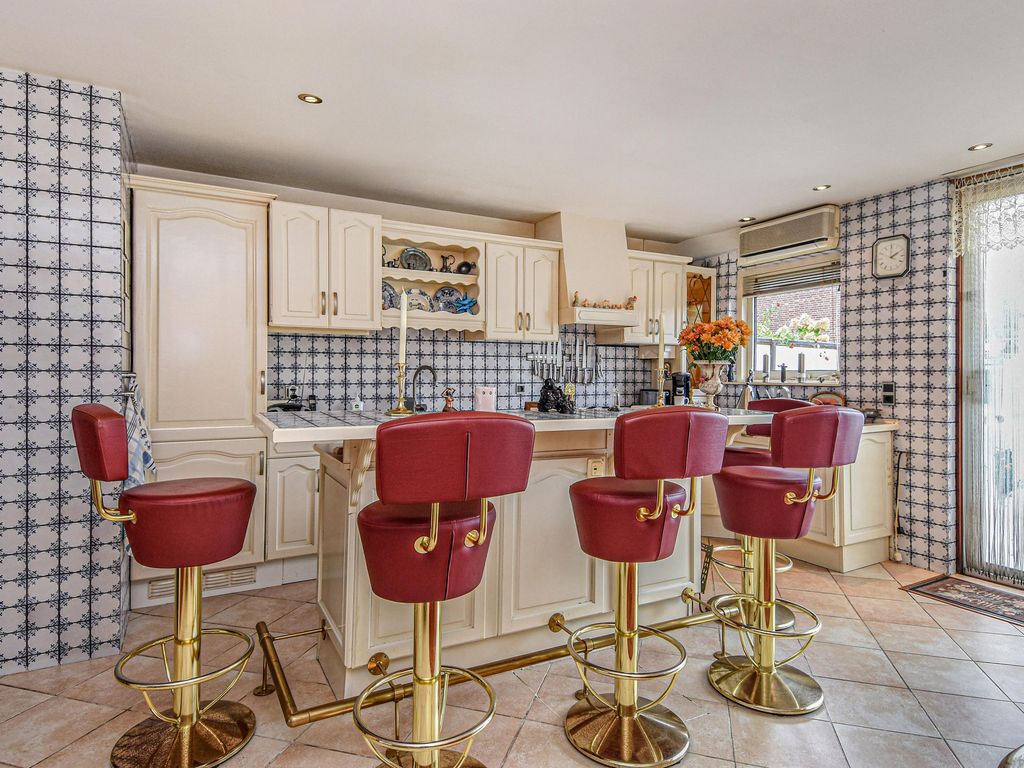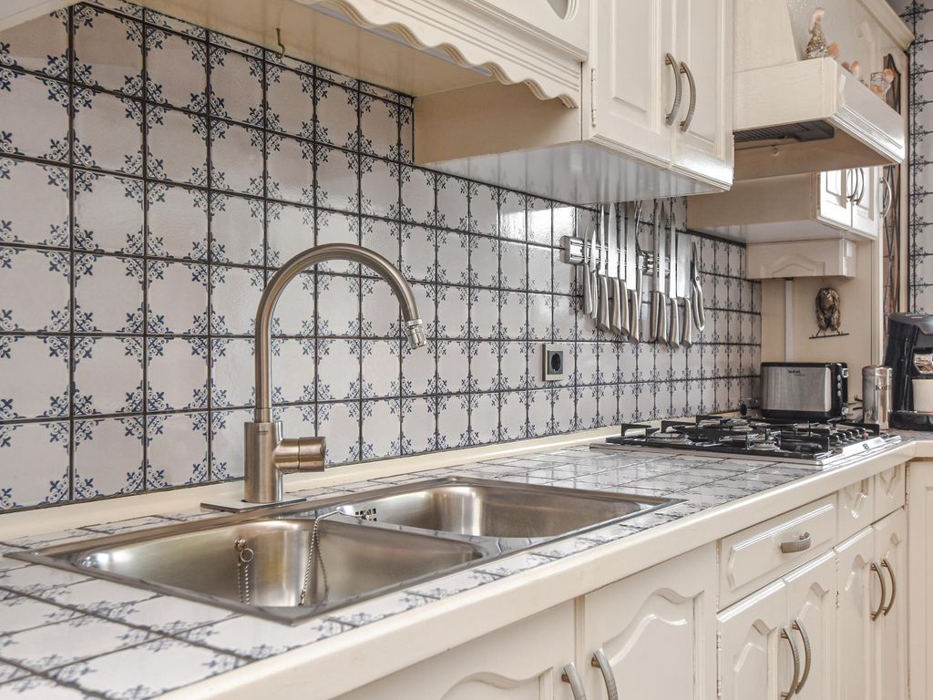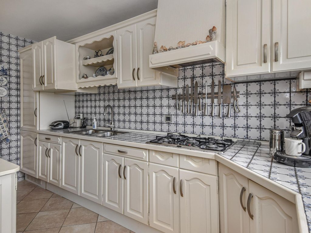 Eenvoudige open keuken (ca. 4.18 x 1.94m) in hoekopstelling met onder- en bovenkasten, 5-pits gaskookplaat, afzuigkap, oven, koelkast en vriezer.