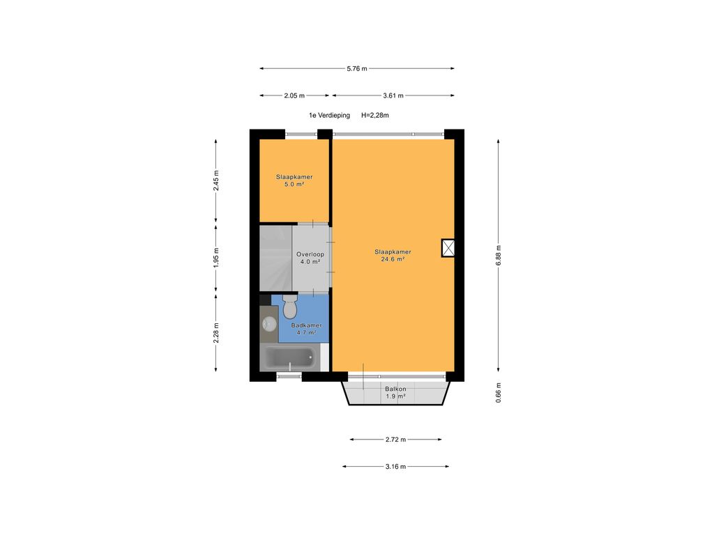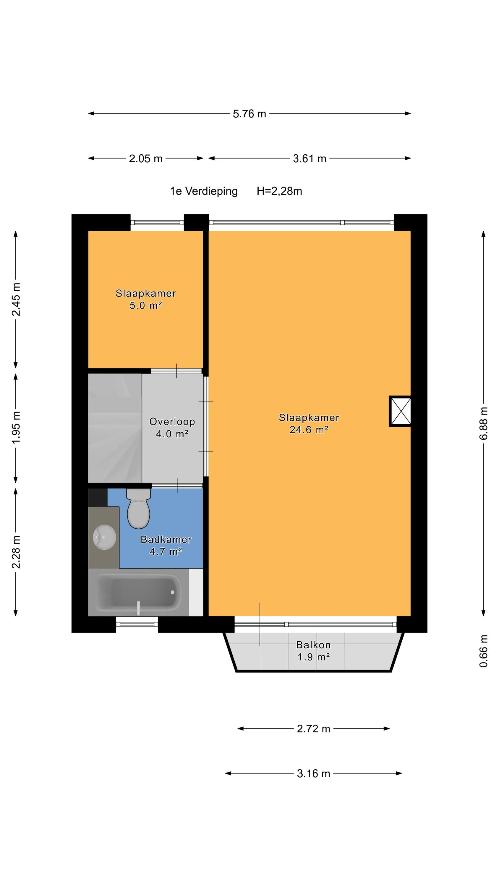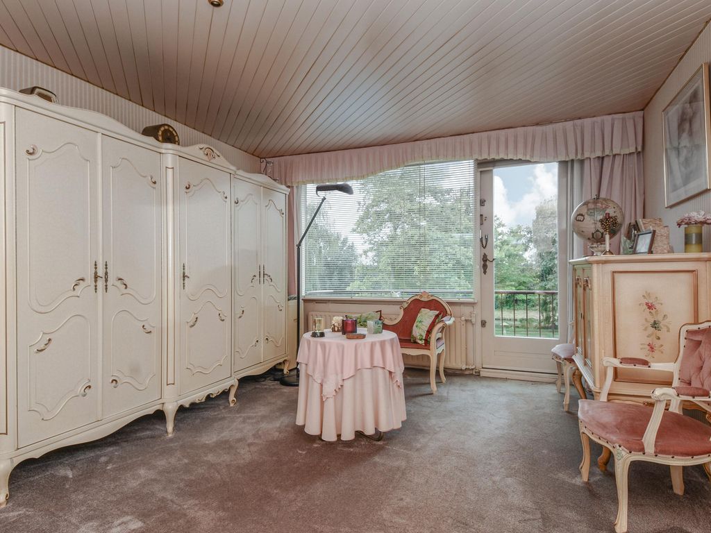 Grote doorgebroken slaapkamer (ca. 6.88 x 3.61m) met deur naar het balkon.