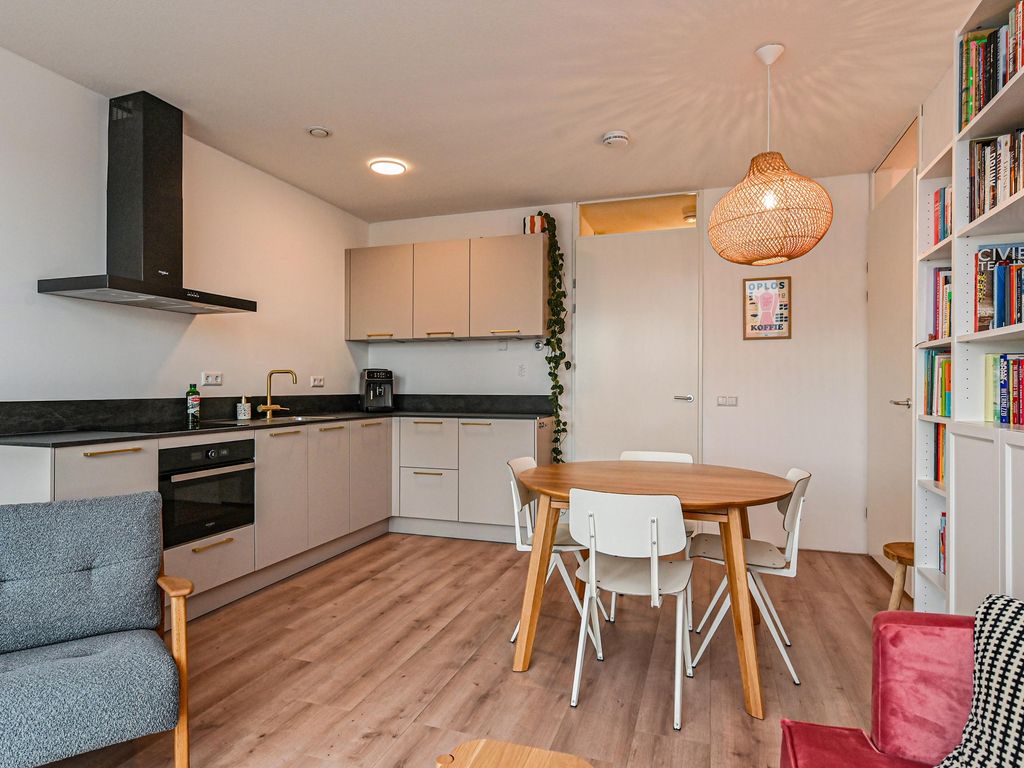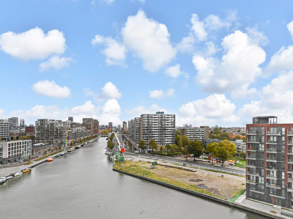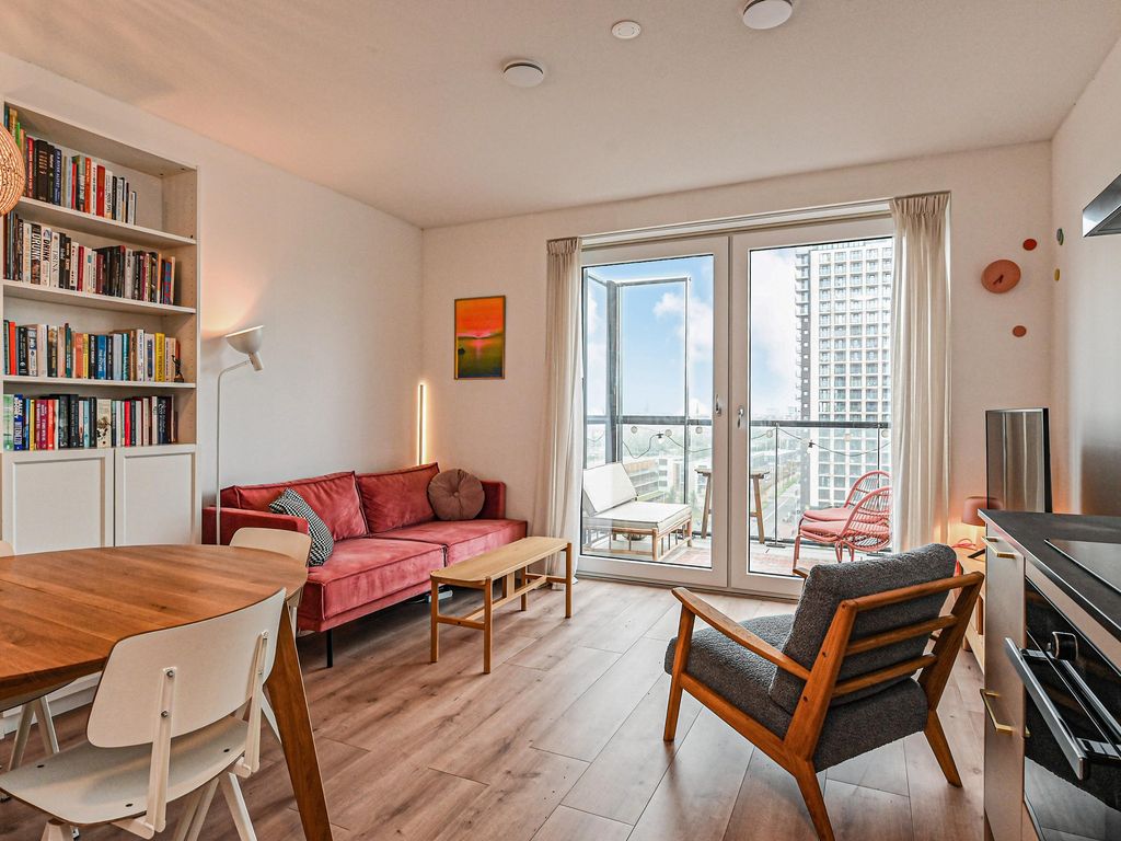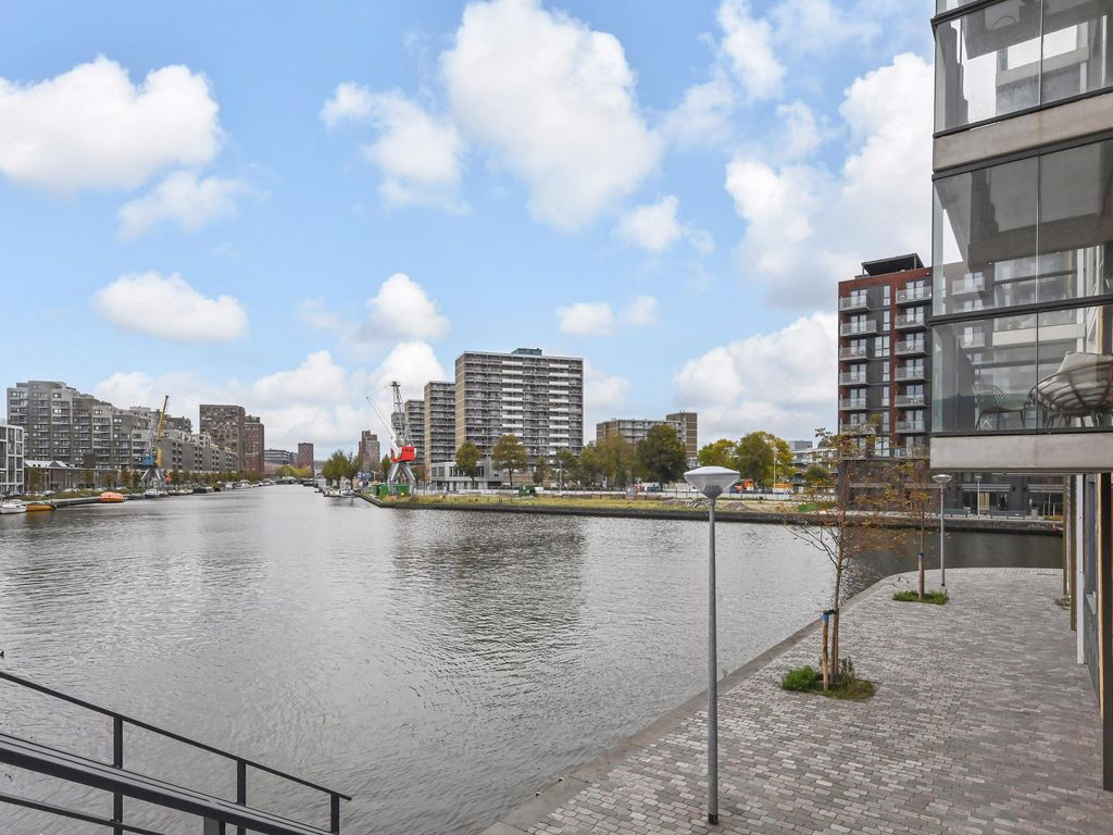 Ruime wooneetkamer (ca. 5.20 x 4.06m) met weids uitzicht over het water. De openslaande deuren naar het balkon zorgen voor veel natuurlijke lichtinval. De vloerverwarming en vloerkoeling garanderen het hele jaar door een aangenaam binnenklimaat.