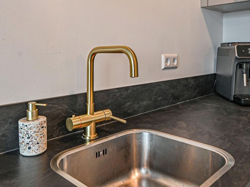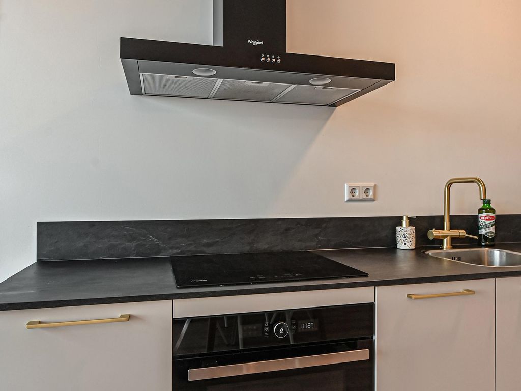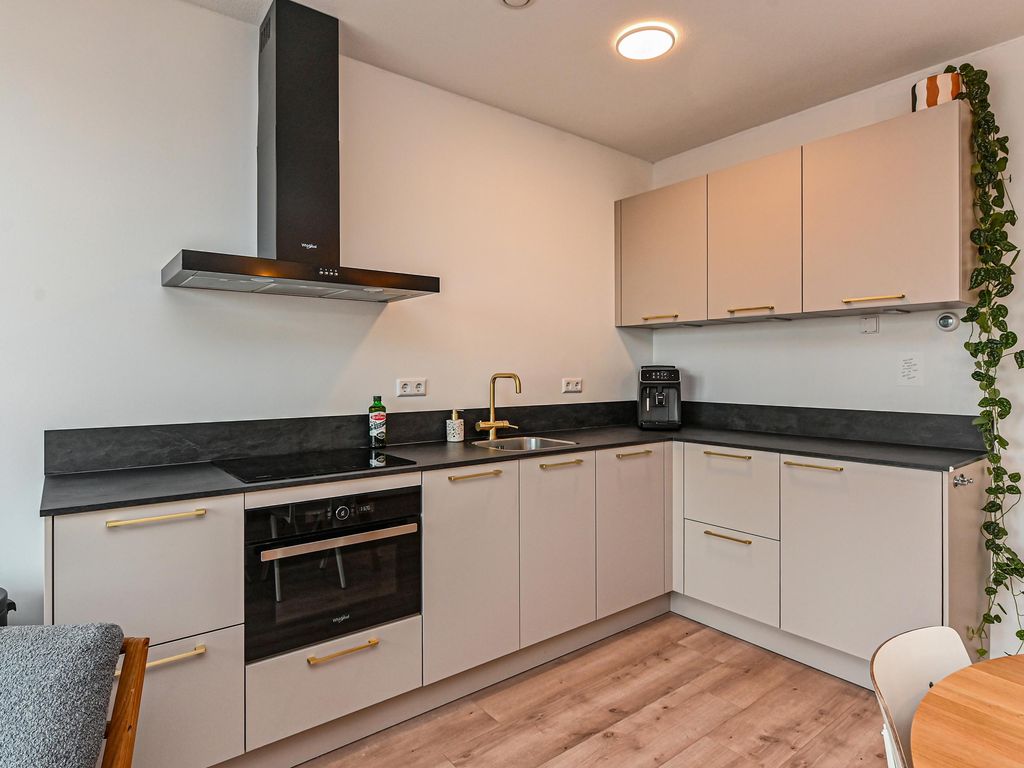 Moderne open keuken in hoekopstelling met 4-pits inductiekookplaat, afzuigkap, combi-oven, Celisiuz kokend water kraan, koelkast en vaatwasser.